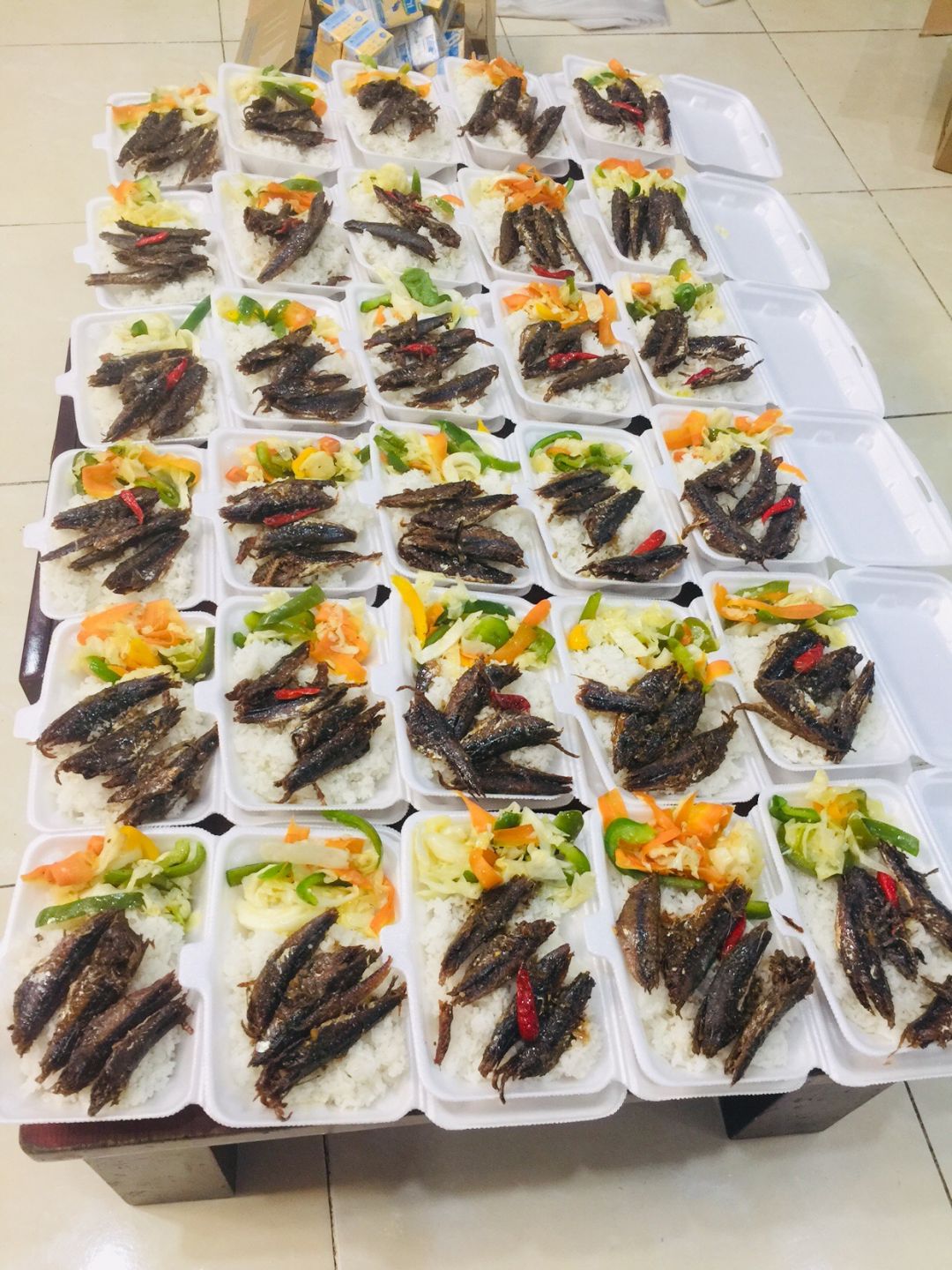 Chiều nấu 160 phần cơm cá chiên sốt cà+ dưa leo, canh bí đỏ+ sườn que.