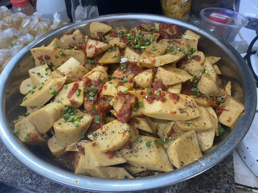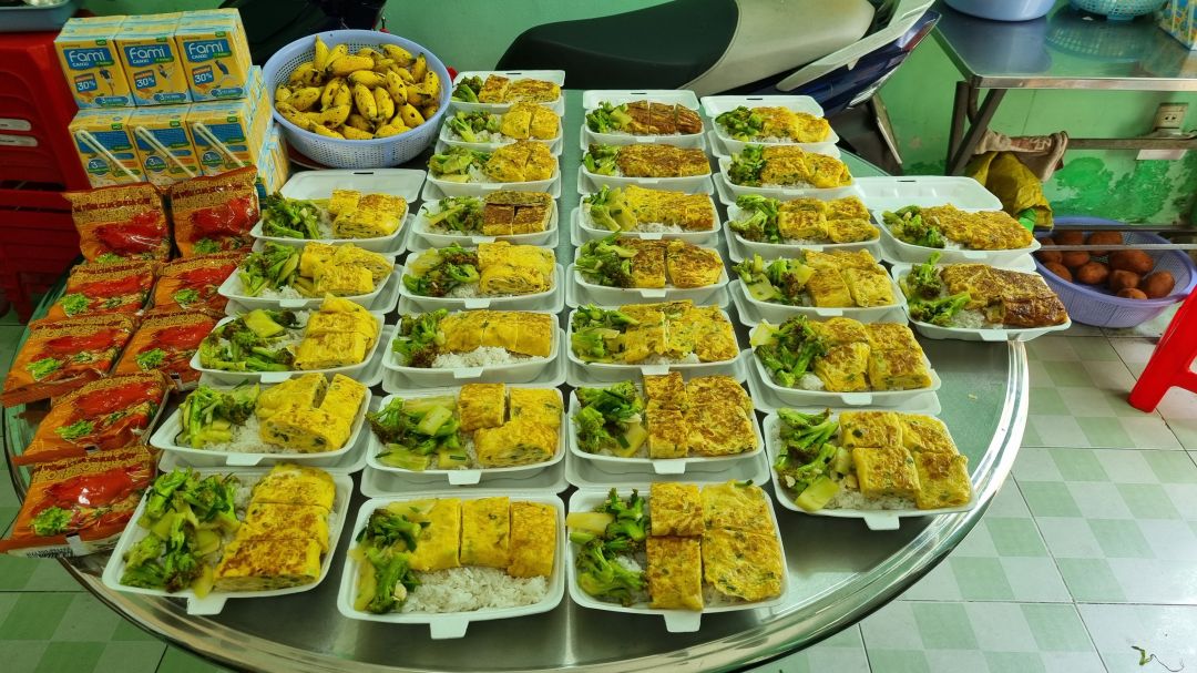 Sáng nấu 160 phần cơm thịt heo kho trứng; bắp cải xào hành tây và sữa Fami