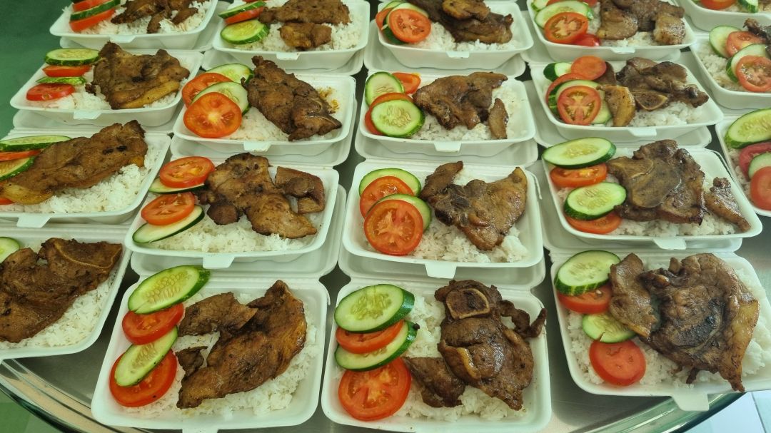- 90 phần cơm chiều : gà xào gừng, đậu que xào với gan và thịt, canh chua, sữa Fami.