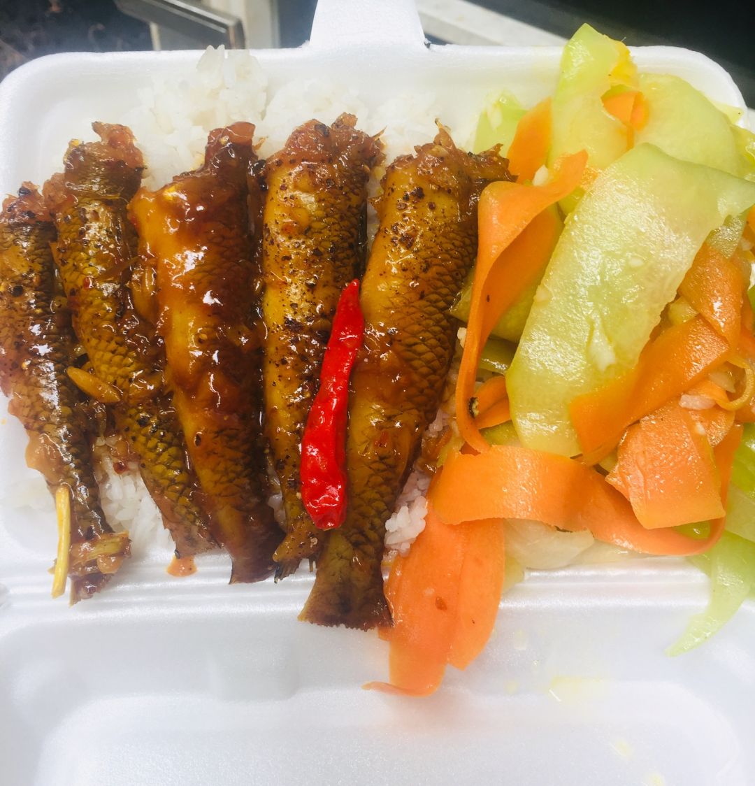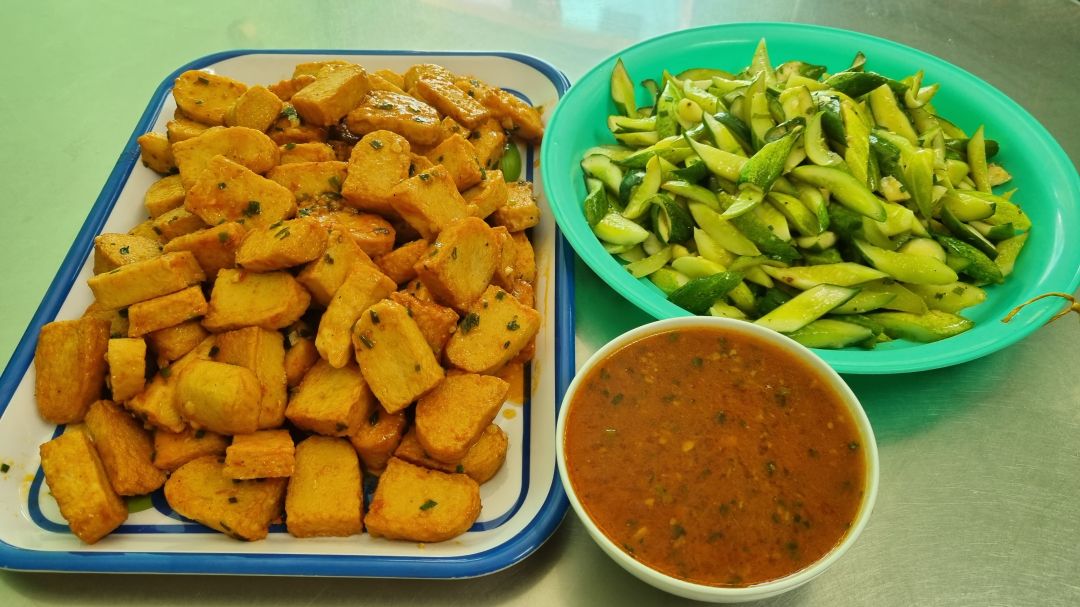 Chả cá basa hấp sốt cà. Dưa leo xào tỏi. 1 hộp sữa đậu nành Fami.