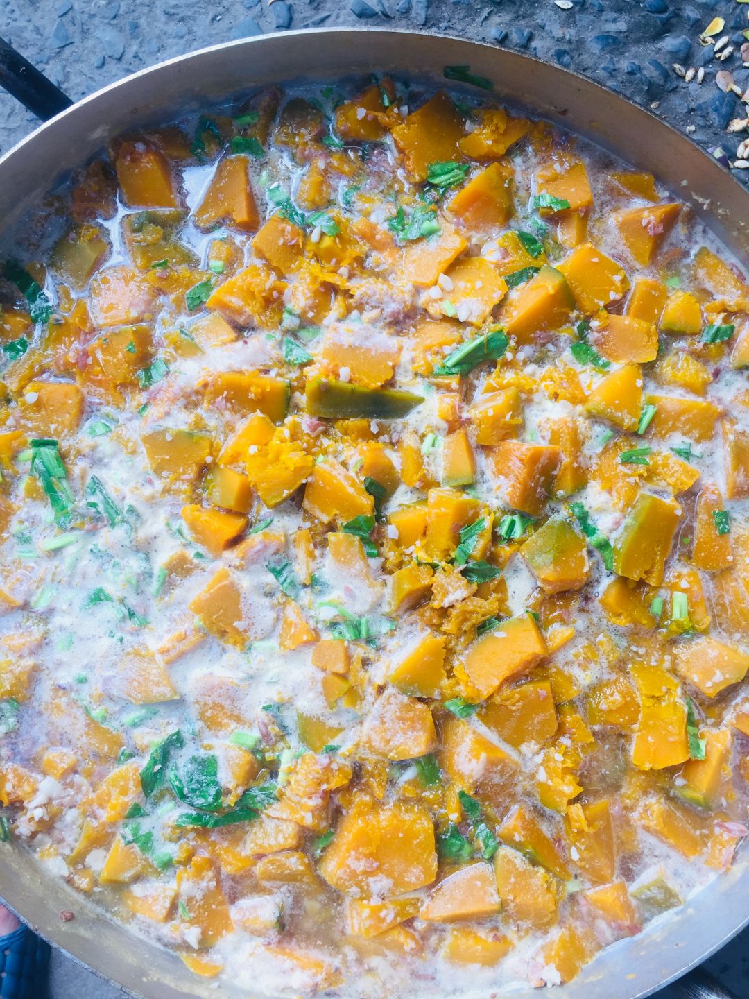 Chiều nấu 170 phần cơm thịt cốt lết nướng sả ớt; cà tím xào; canh bí đỏ+ đậu phộng; sữa Fami
