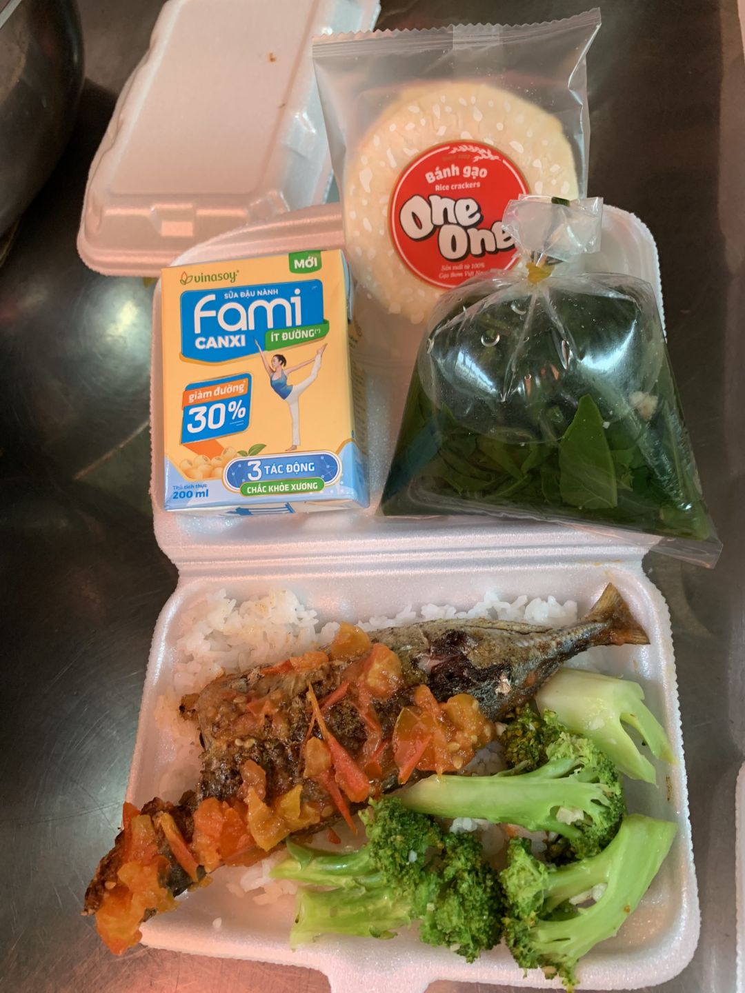 Ngày 19/8 nấu 60 phần cơm : cá chiên sốt cà, bông cải xào, canh rau thịt bằm, sữa Fami, bánh gạo.