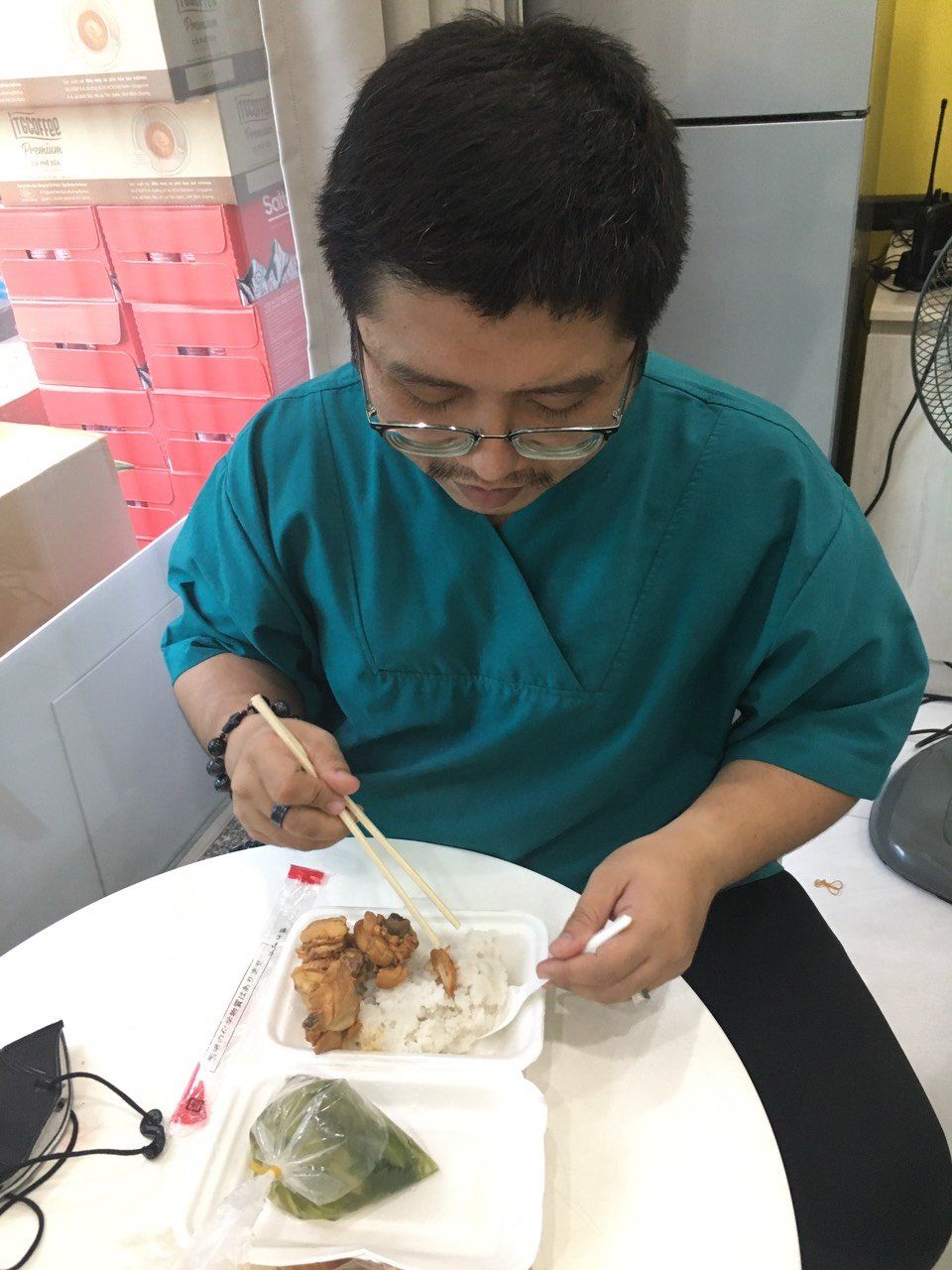 Một nhân viên của phòng Công tác Xã hội đang dùng suât cơm gà của bếp Thảo đây các bạn.