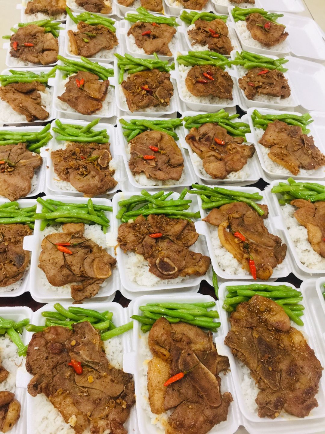 Sáng nấu 180 phần cơm thịt cốt lết nướng sả ớt; canh bí đao+ sườn que; rau bắp cải+ su su+ cà rốt+ ớt chuông xào; sữa Fami.