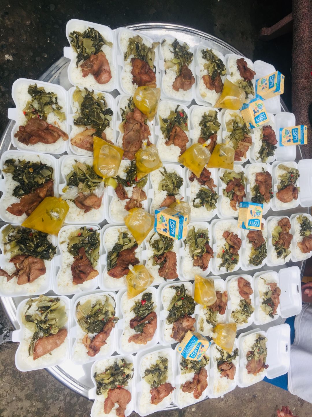 Chiều : 63 phần cơm đùi gà xối mỡ, rau muống xào, canh mồng tơ mướp với thịt nạt.