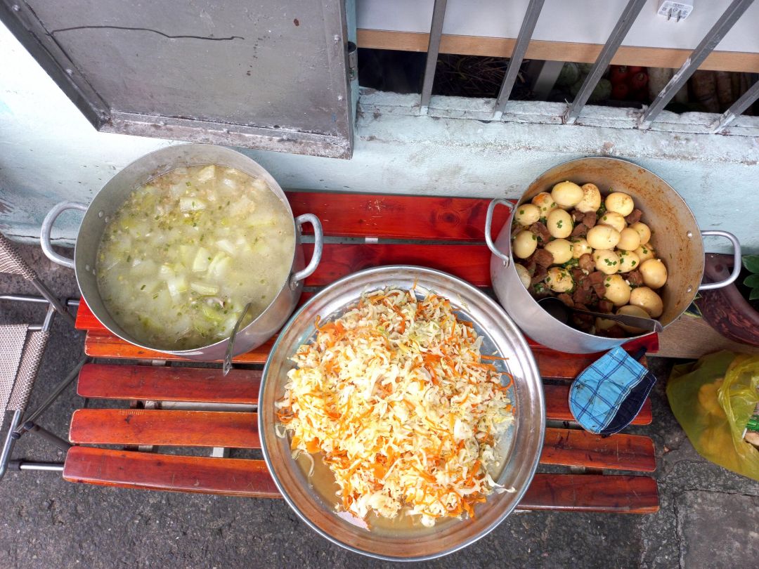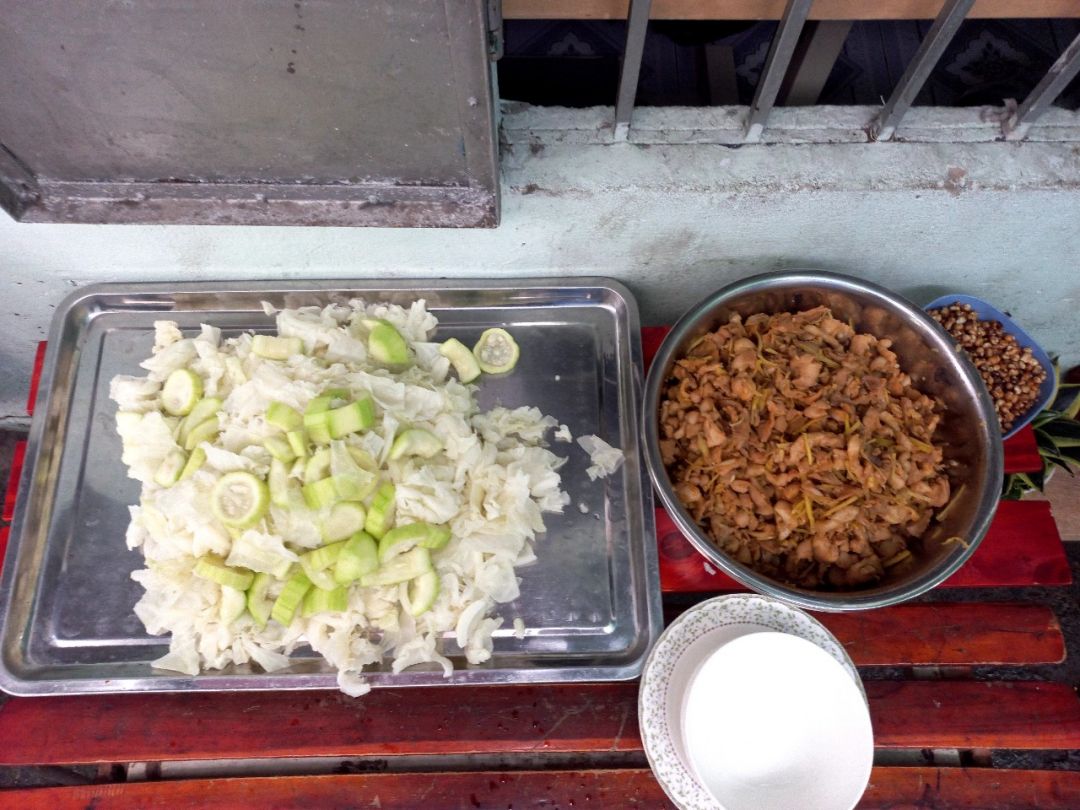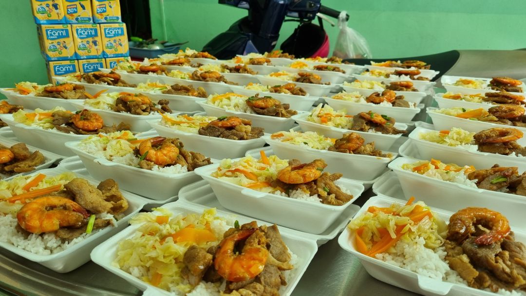 Chiều nấu 225 phần cơm thịt kho củ cải trắng; bắp cải xào tỏi tây; canh cải thảo+ sườn que và sữa Fami.