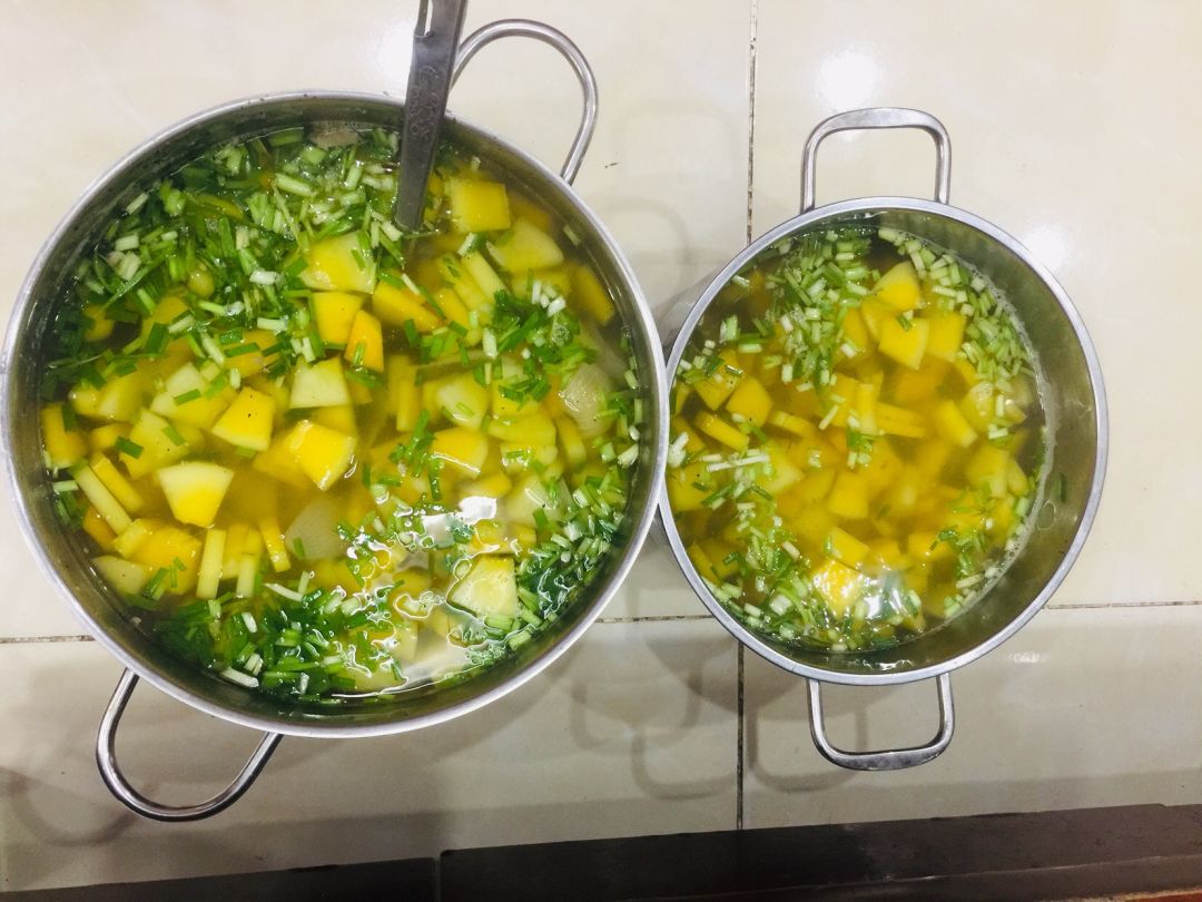 - Chiều : 64 phần cơm cá kho cà, canh đu đủ nấu với xương, sữa Fami, chuối sáp nấu.