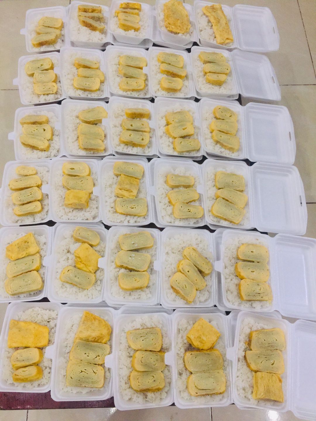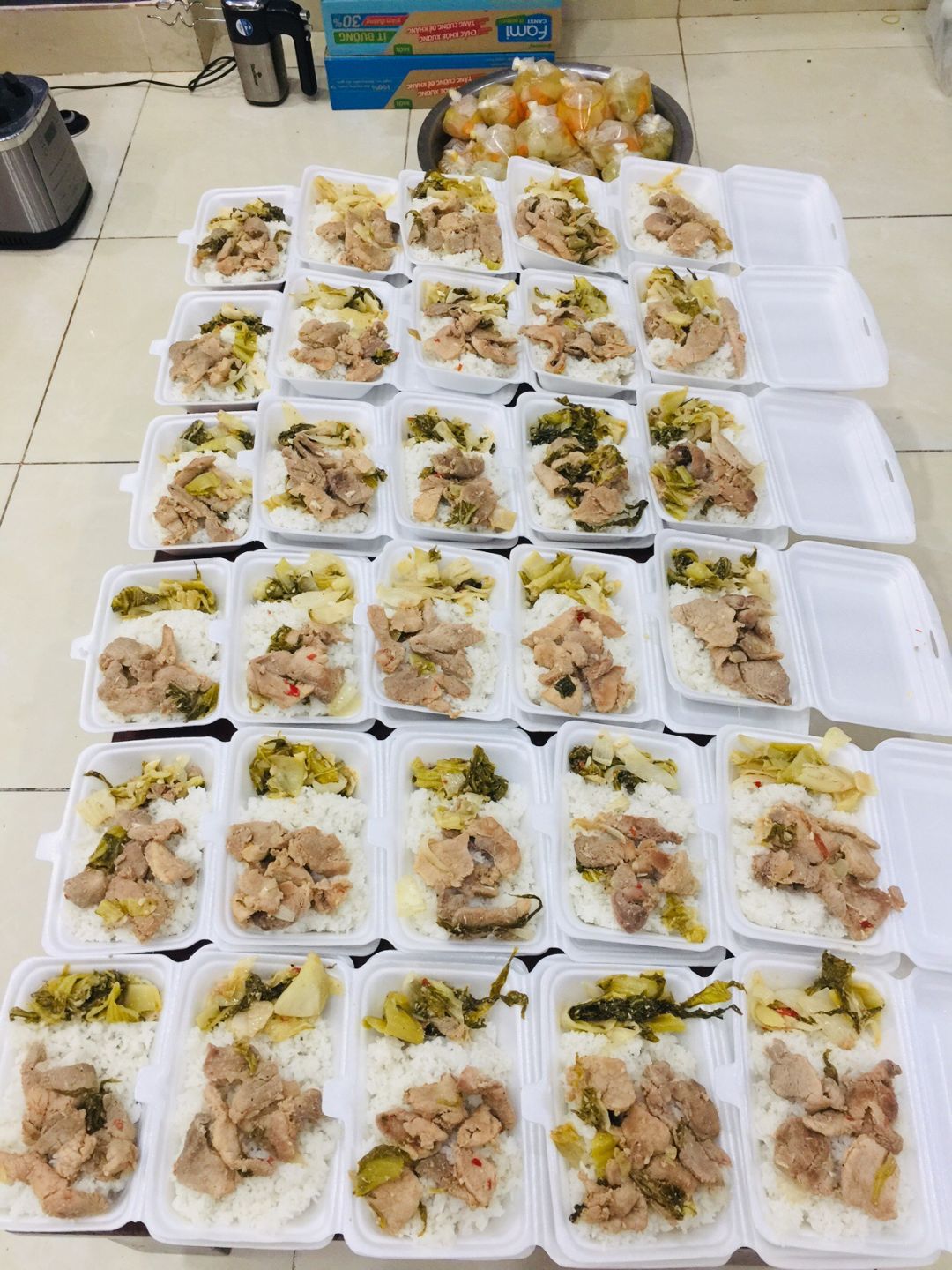 - Chiều : 64 phần cơm tôm rim thịt, canh cải ngọt thịt bằm, sữa Fami