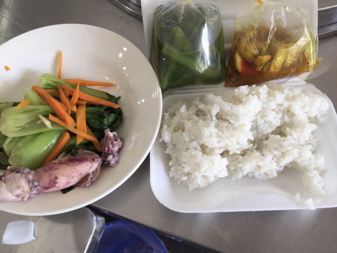 Chiều : 64 phần cơm sườn cốt lếch ram mặn, rau muống xào, canh bí đỏ nấu với xương, sữa Fami, bonus bánh plan nhà làm.