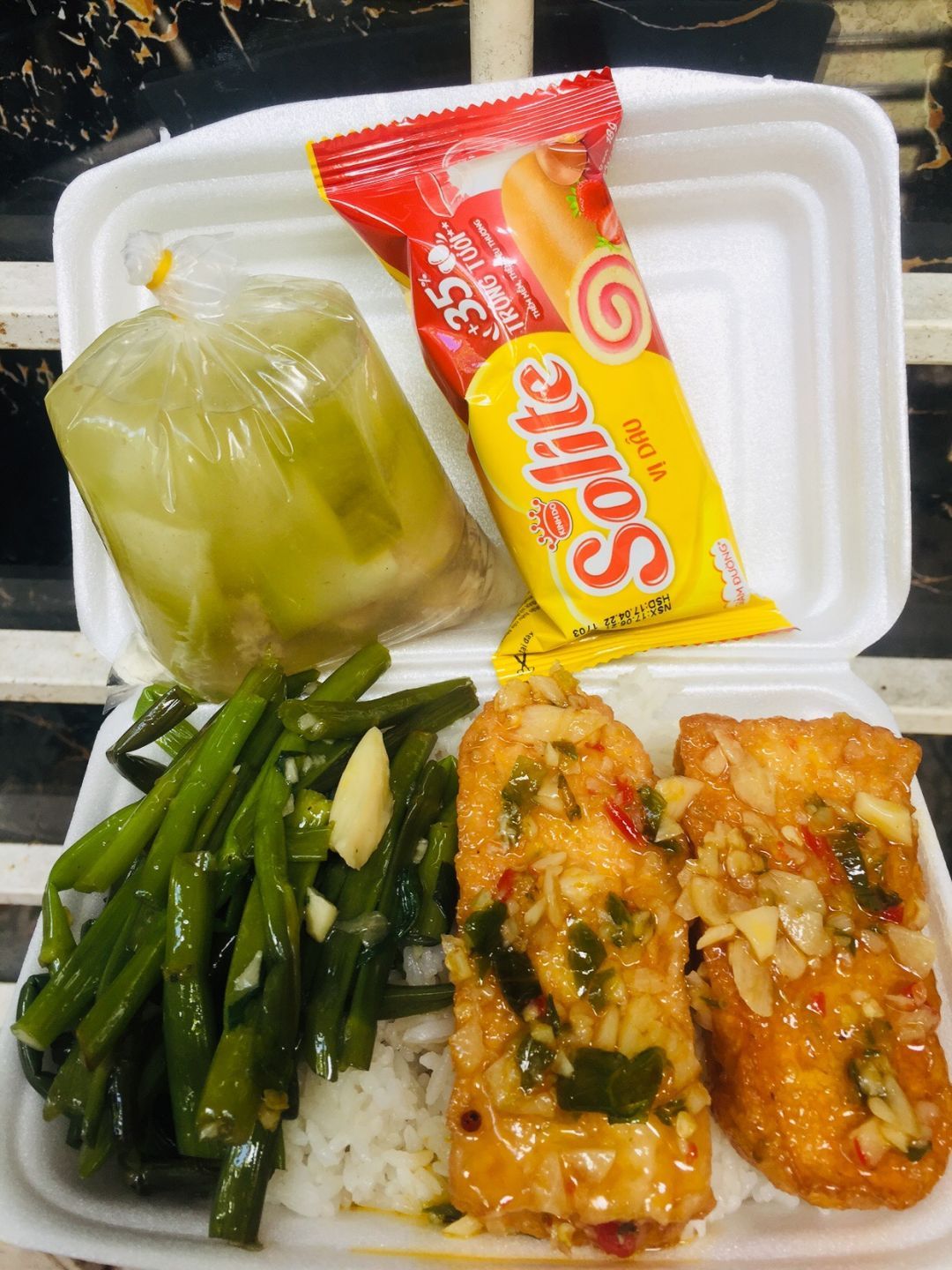 - trưa : 64 phần cơm thịt ram mặn, rau muống xào, canh bí đao nấu xương, sữa Fami