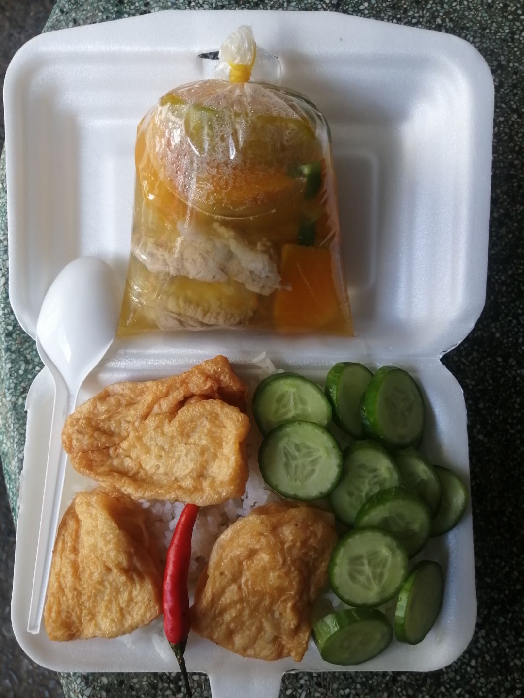 Chiều : 64 phần cơm đùi gà roti, bầu xào, canh bắp cải nấu xương.