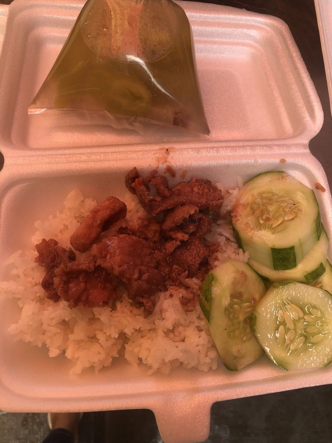 Chiều : 64 phần cơm đùi gà xối mở, rau muống xào, canh bắp cải nấu với xương, sữa Fami.