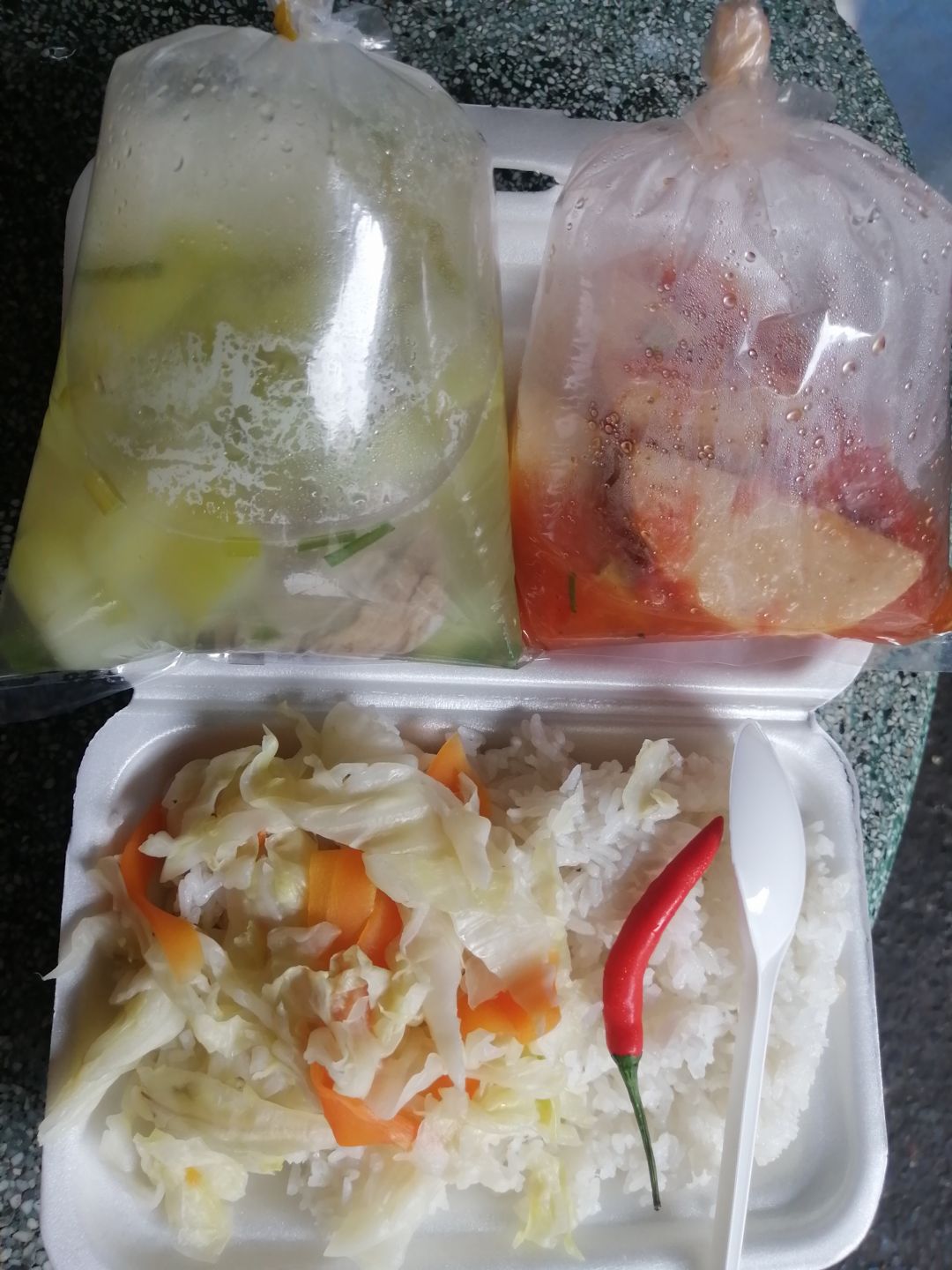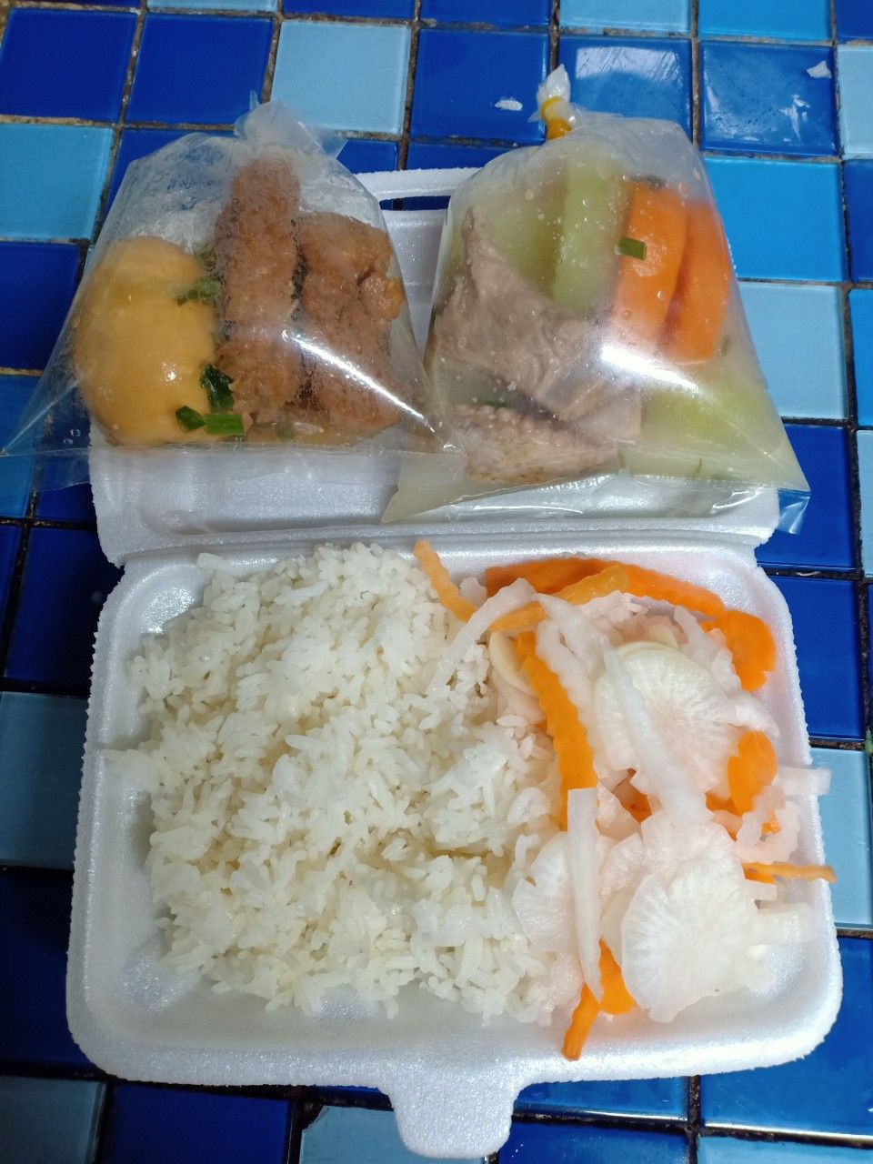 - Trưa : 64 phần cơm cá chiên và opla, bầu xào, canh bí xanh nấu xương.