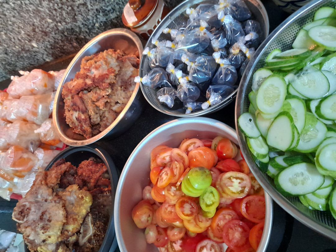 Sáng nấu 265 phần cơm gà kho nghệ; dưa leo cắt lát; canh bí đao+ sườn que.