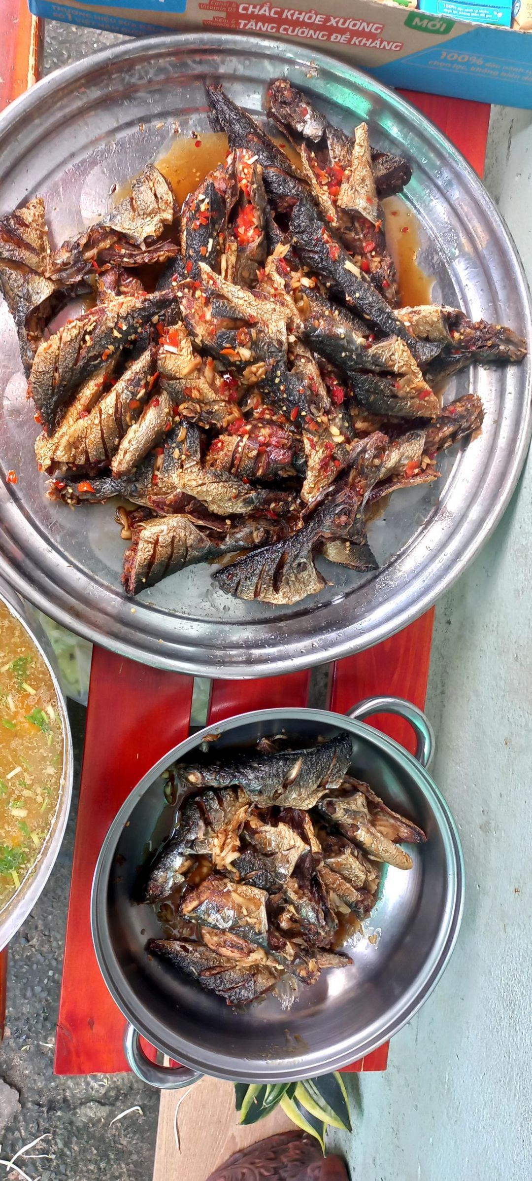 Sáng nấu 245 phần cơm cá saba chiên; rau muống xào tỏi; canh cải ngọt+ sườn que.