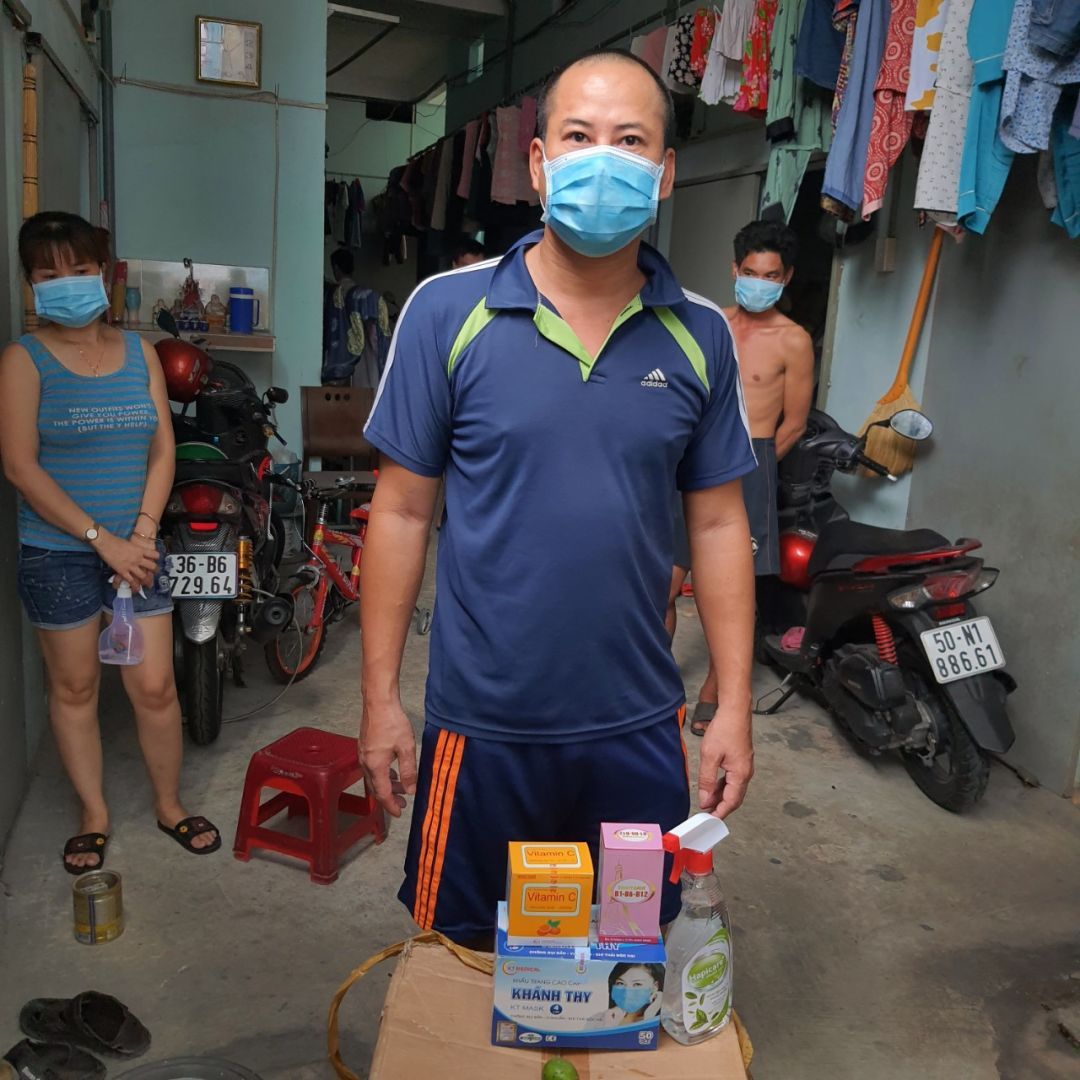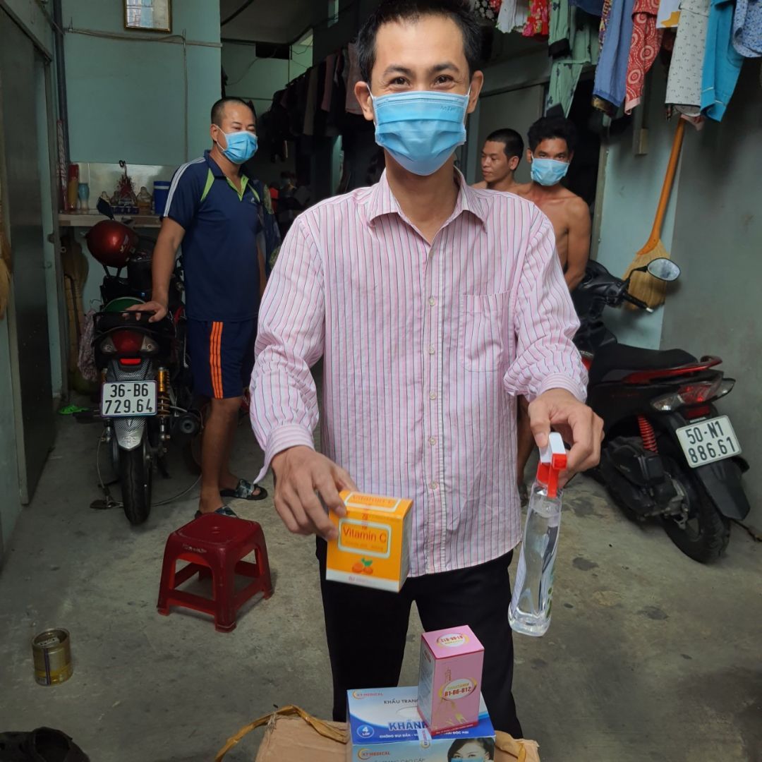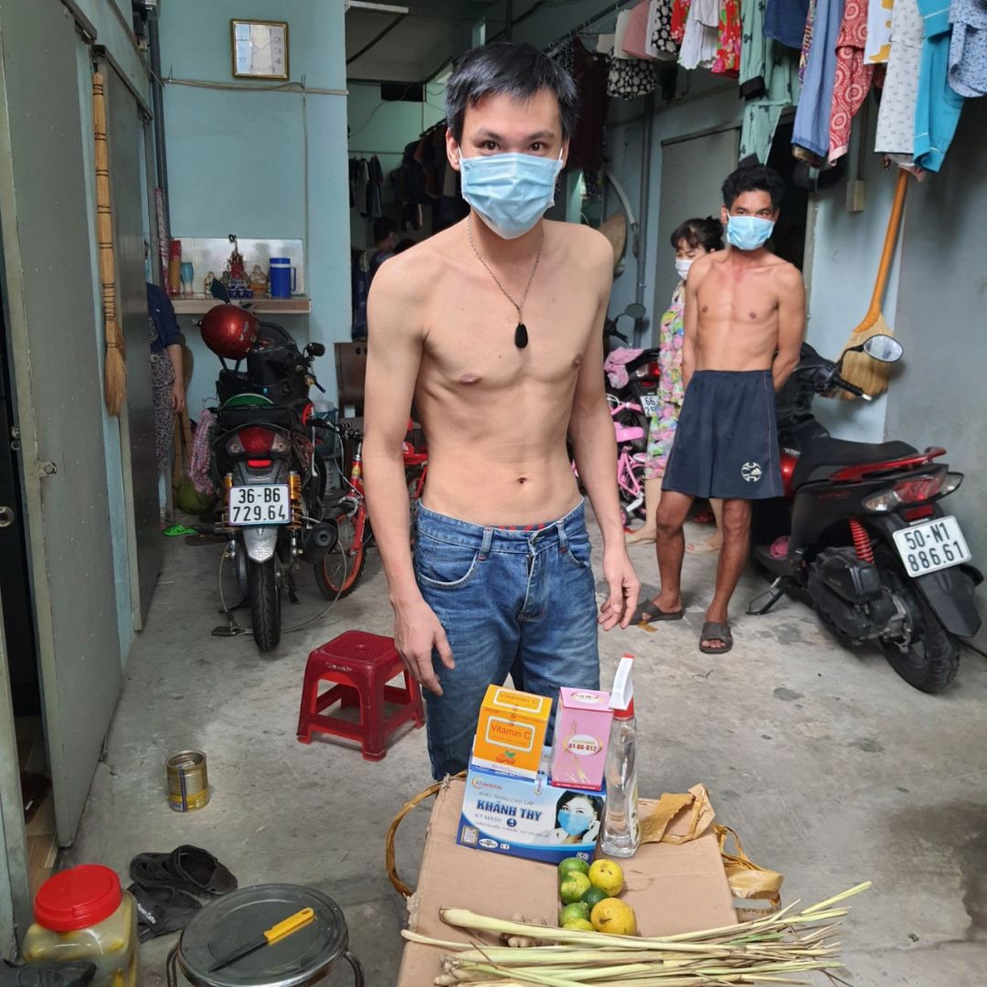 Dãy nhà trọ hiện đang bị phong tỏa do có 12/57 người bị nhiễm ( hiện tại những người còn lại 1 số đang có dấu hiệu ho sốt ạ ) . mọi người đang tự cách ly tại trọ do bên y tế bị quá tải nên không có người xuống test lại cho trọ cũng như đưa người bị đi cách ly ạ . Em xin được hỗ trợ thuốc và nước xịt khuẩn , khẩu trang và chanh cho 26 hộ ở đây ạ