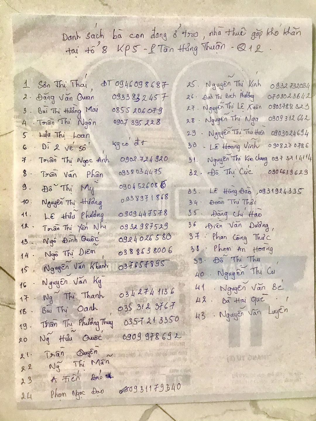 Tieuhuongduong nhận danh sách 43 công nhân, lao động khó khăn đang ở trọ hẻm đường DHT06, Tổ 8, khu phố 5, phường Tân Hưng Thuận, quận 12. Khu vực này gần khu nghĩa địa, vừa được dở phong tỏa cách đây vài ngày, anh chị em sống trong các khu trọ chật hep, nguy cơ lây nhiễm dịch cao.