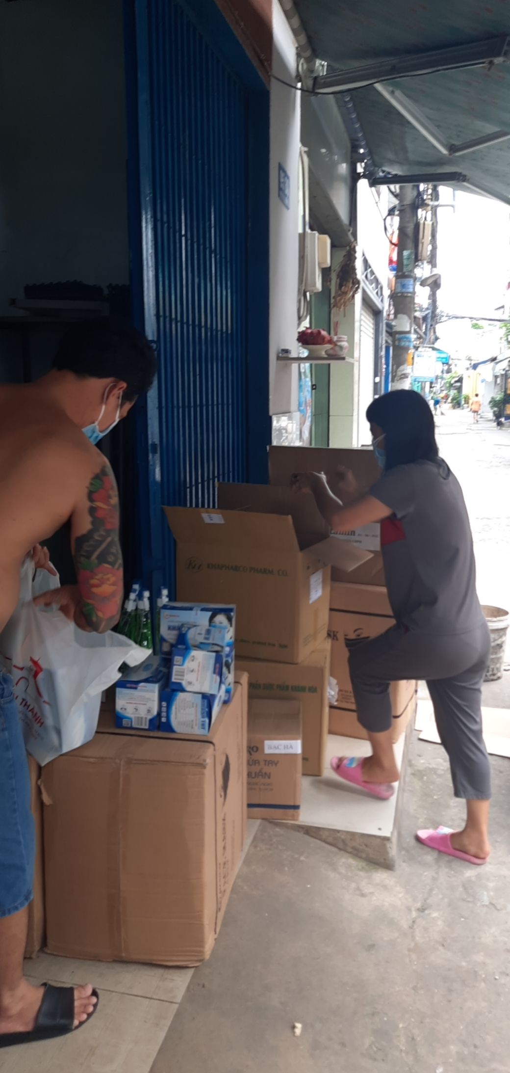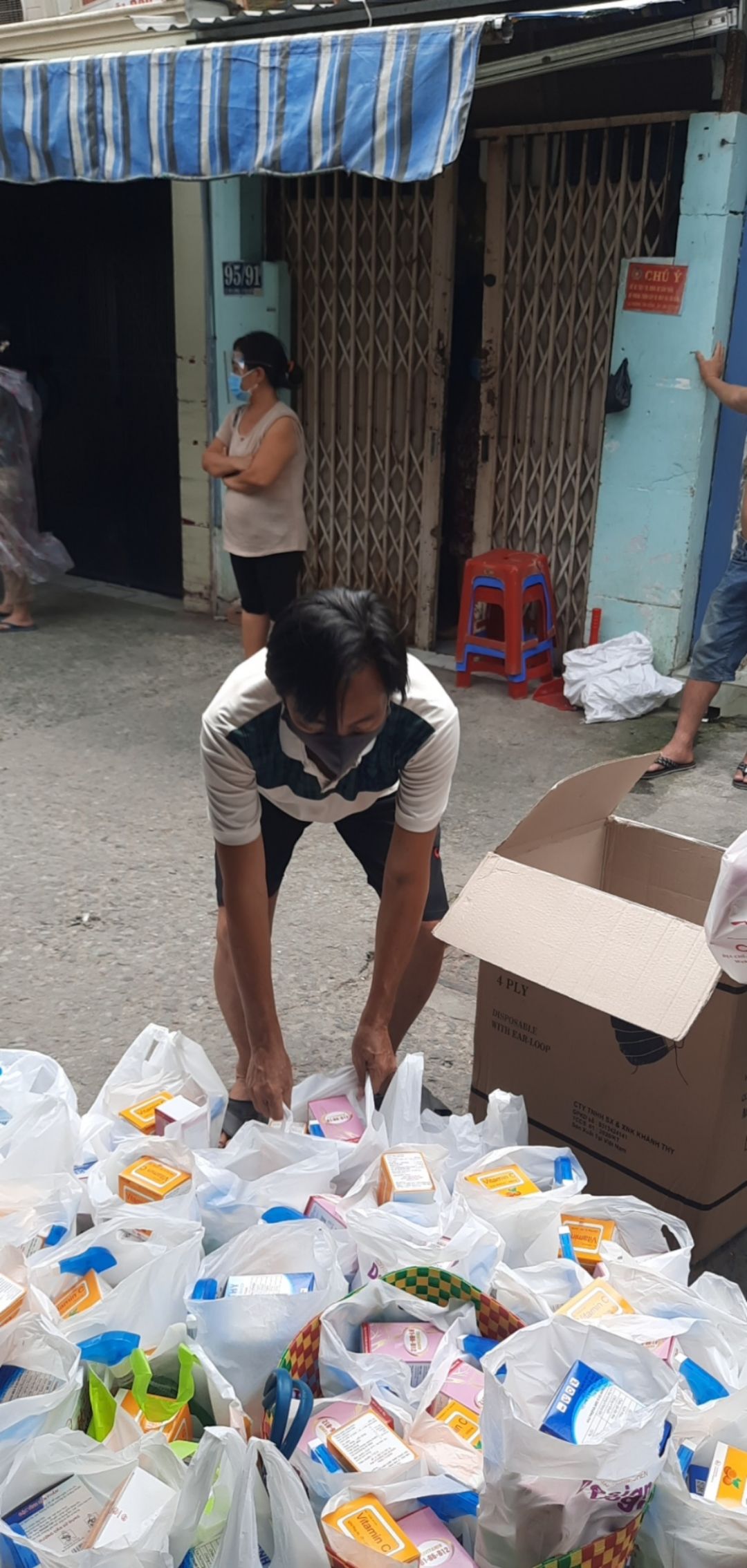 Nhờ vào mối quan hệ tốt với các nhà máy sản xuất của chị Phúc (vợ bác P.Quyen)- Chủ nhân căn nhà 14/1 Ngô Quyền mà chúng ta đang sử dụng suốt 12 năm qua nên sáng sớm hôm qua 6x đã nhận được 17 thùng Khẩu trang y tế (50 hộp/thùng), 10 thùng Vitamin 3B (165 hộp/thùng), 8 thùng Vitamin C (100 hộp/thùng) để kịp thời trao cho 231 hoàn cảnh thuộc phường Tân Kiểng, Q7.