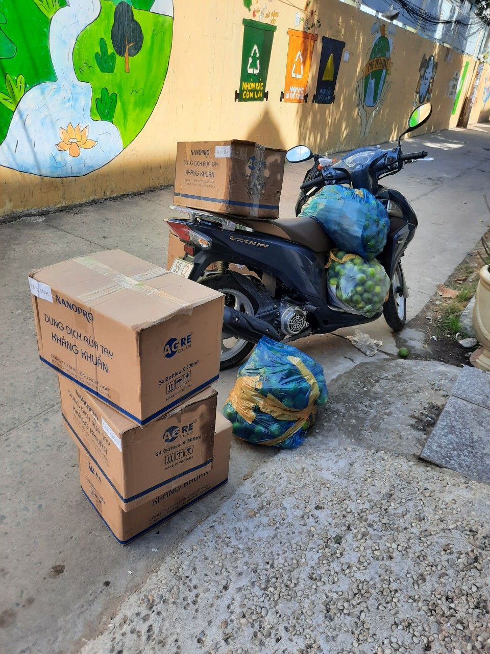 Cũng trong chiều hôm qua 6x tiếp tục nhận được 35 thùng dung dịch sát khuẩn (24bình/tthùng) để có thể tiếp tục trao tới tay bà con khó khăn.