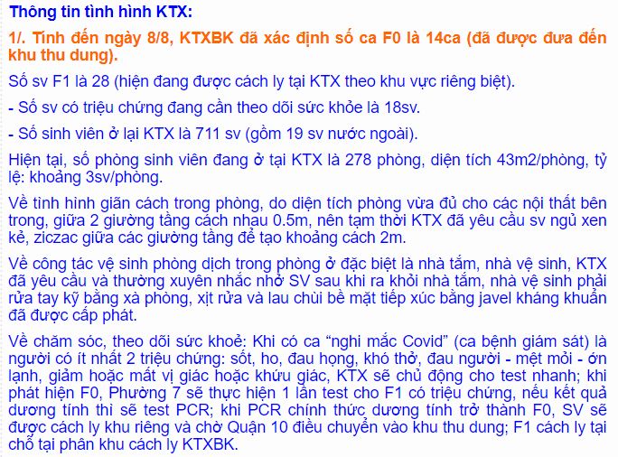 Tính đến ngày 8/8, KTXBK (497, Hòa Hảo, Phường 7, quận 10, tp Hồ Chí Minh) đã xác định số ca F0 là 14ca (đã được đưa đến khu thu dung).