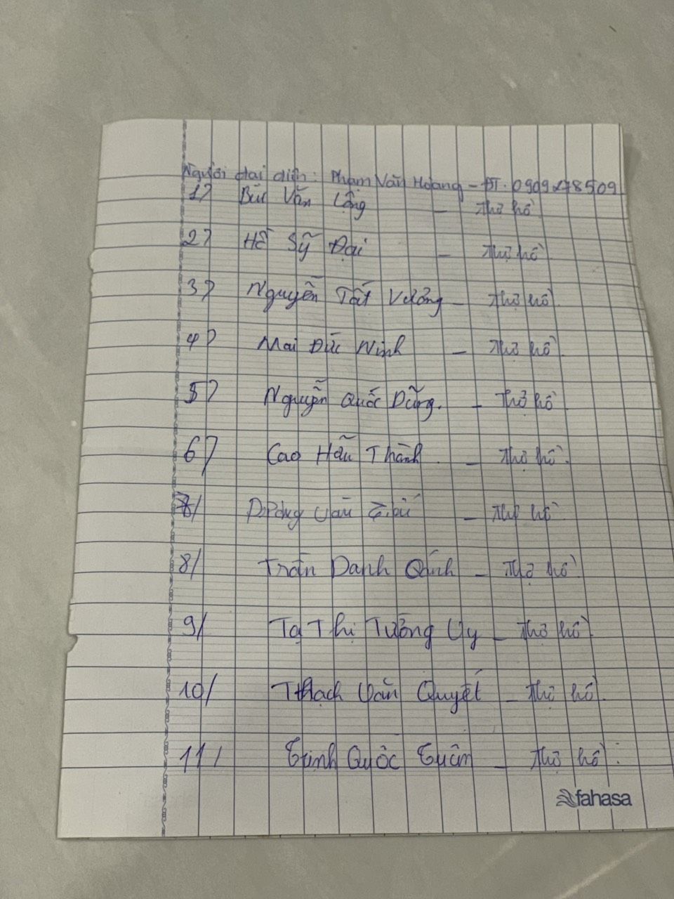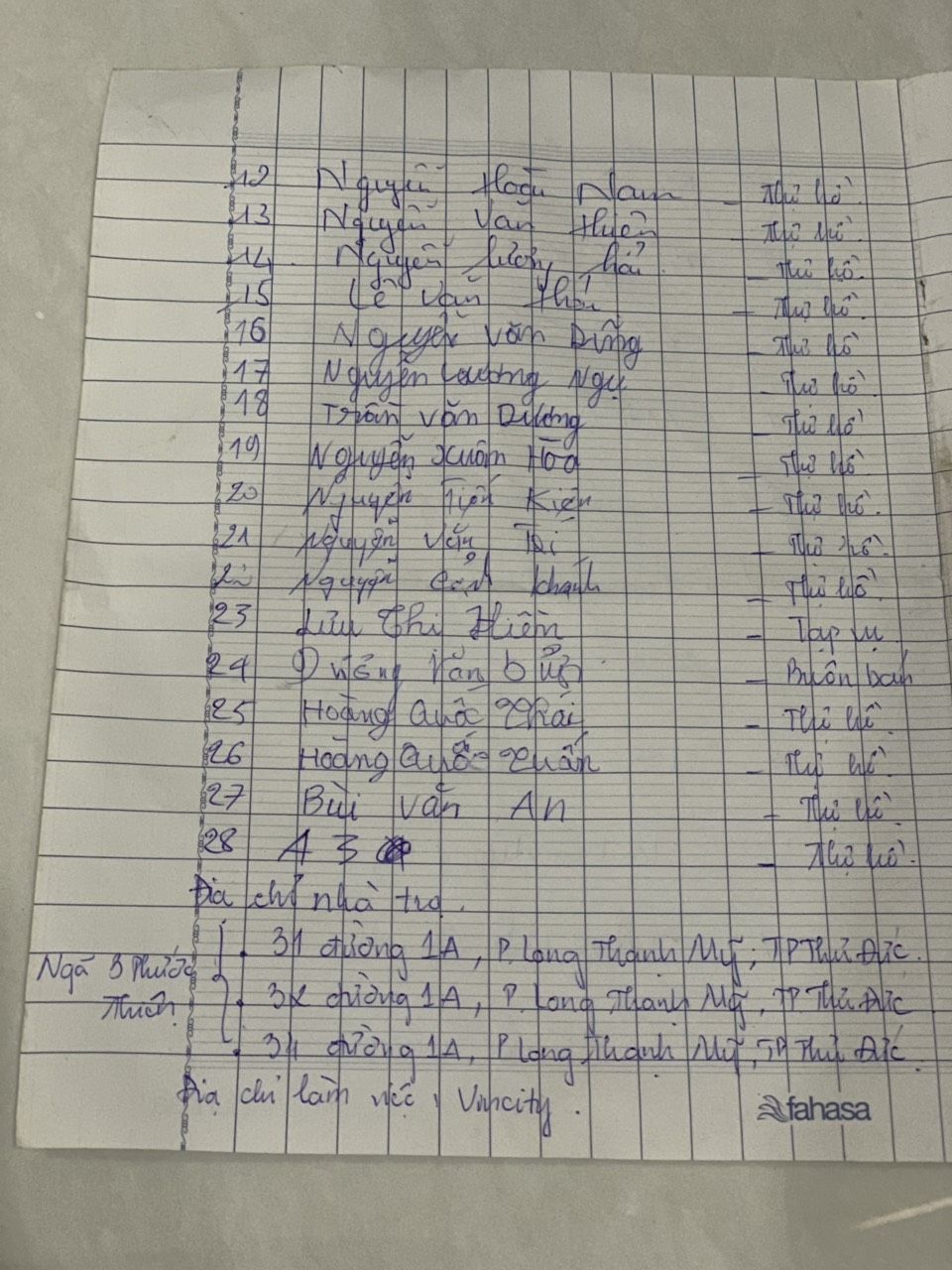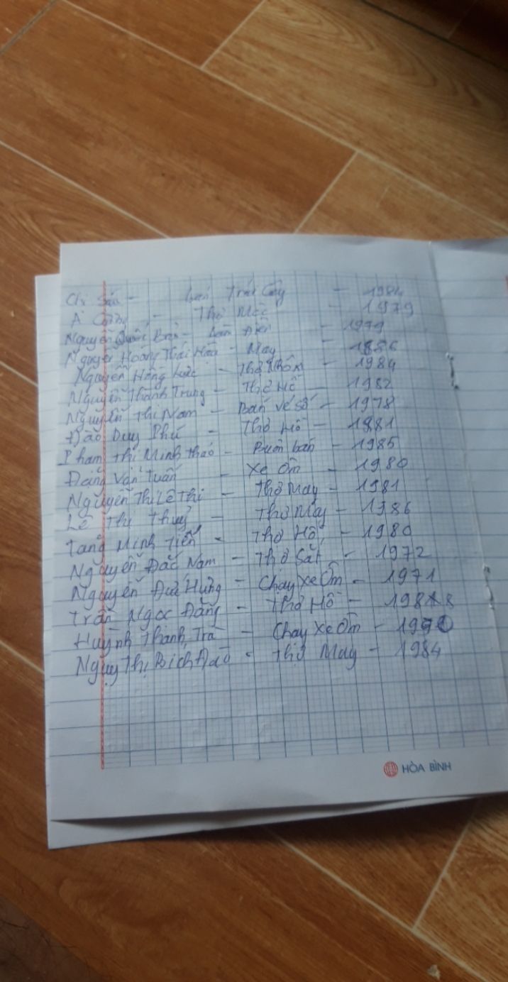 Tieuhuongduong xin gởi danh sách các thợ hồ đang ở trọ tại đường 1A, phường Long Thạnh Mỹ, thành phố Thủ Đức.