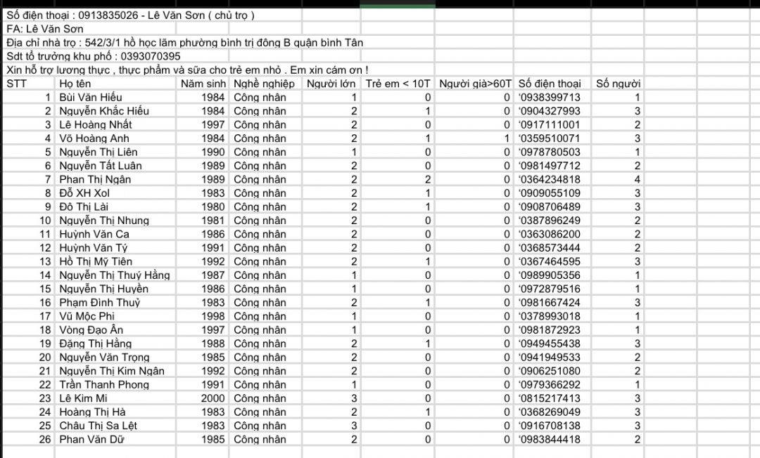 Tieuhuongduong nhận danh sách 48 người lao động làm thợ may, thợ hồ, bán hàng rong...đang gặp khó khăn do không có việc làm xin hỗ trợ thực phẩm và phần quà khẩu trang, dung dịch sát khuẩn, vitamin.