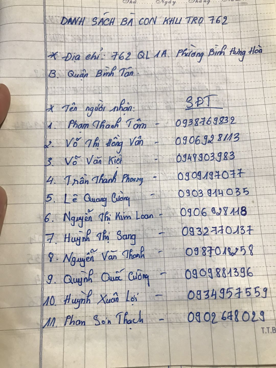 Loannguyen nhận được danh sách xin hỗ trợ của anh Vỹ xin hỗ trợ cho 60 hộ dân đang ở trọ ở địa chỉ 762 QL1A, Phường Bình Hưng Hoà B, Quận Bình Tân. Hẻm có 4 khu trọ trong đó có 2 khu đang phong toả (do có 3F0 và 9F1 đang ở tại nhà), 2 khu đang tự cách ly và bà con cũng đang gặp nhiều khó khăn.