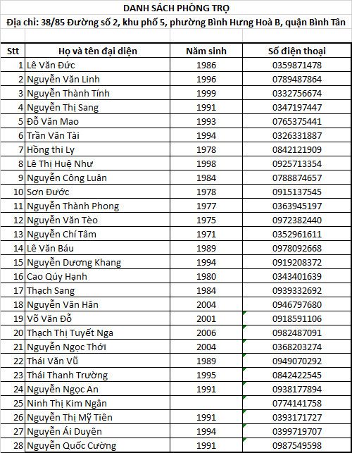 Tieuhuongduong gởi cả nhà danh sách trong file excel bên dưới. Đồng thời, Tieuhuongduong xin đính kèm thêm danh sách 13 hộ ở trọ hẻm 76/42 Lê Văn Phan, phường Phú Hòa, quận Tân Phú. Bà con bám trụ lại thành phố nhiều ngày qua nhưng lại không kiếm ra tiền để trang trải cuộc sống. Chị Nguyễn Thị May - giáo viên mầm non (điện thoại 0375 1260444) đại diện khu trọ nhận quà.