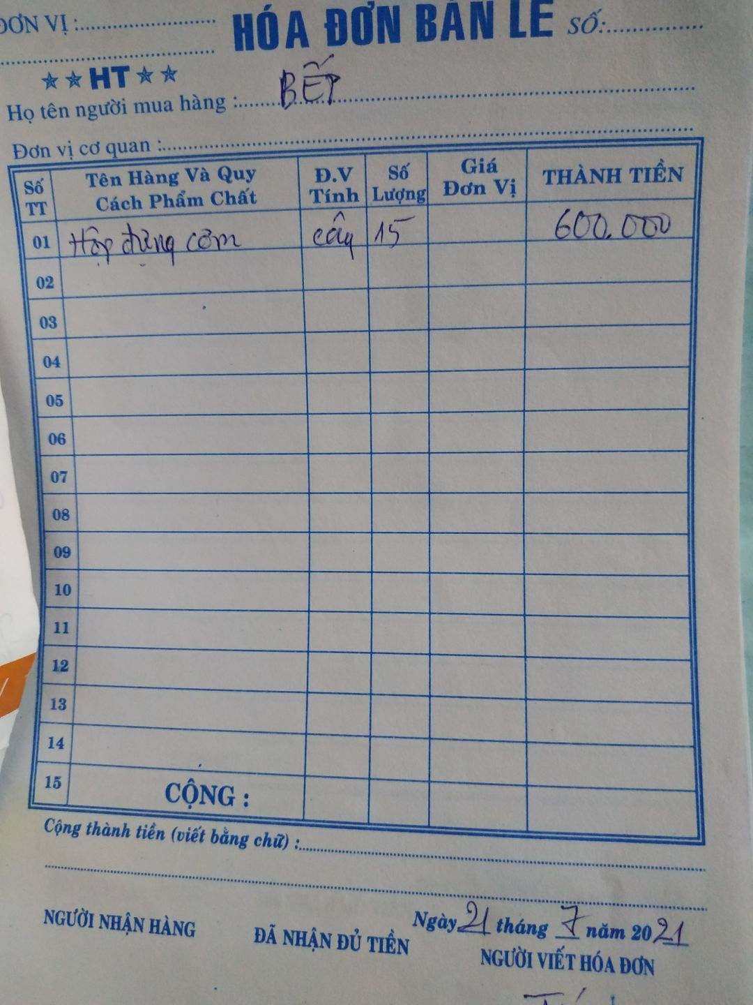 - Mua 15 cây hộp đựng cơm : 40,000đ/cây x 15 cây = 600,000đ