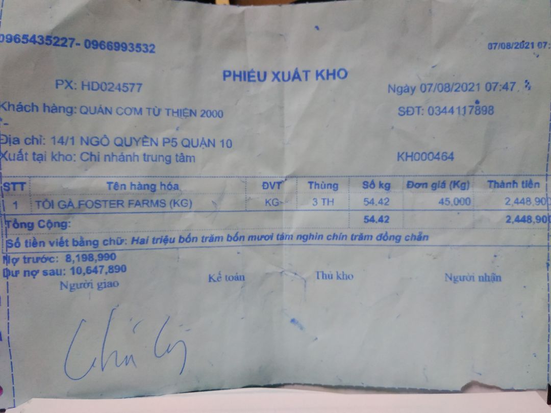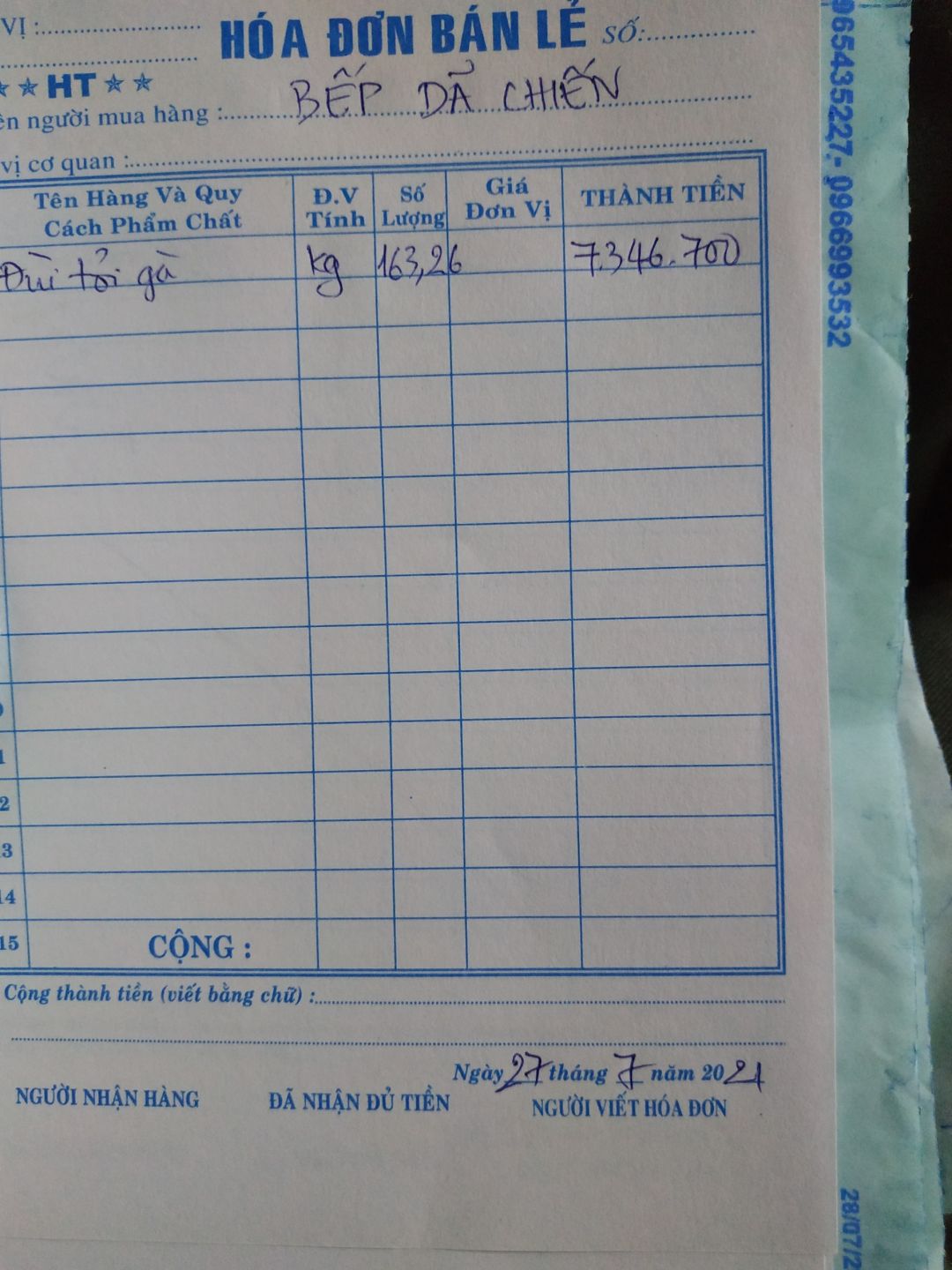 - Mua 163.26kg đùi gà tỏi: 45,000đ/kg x 163.26kg = 7,346,700đ