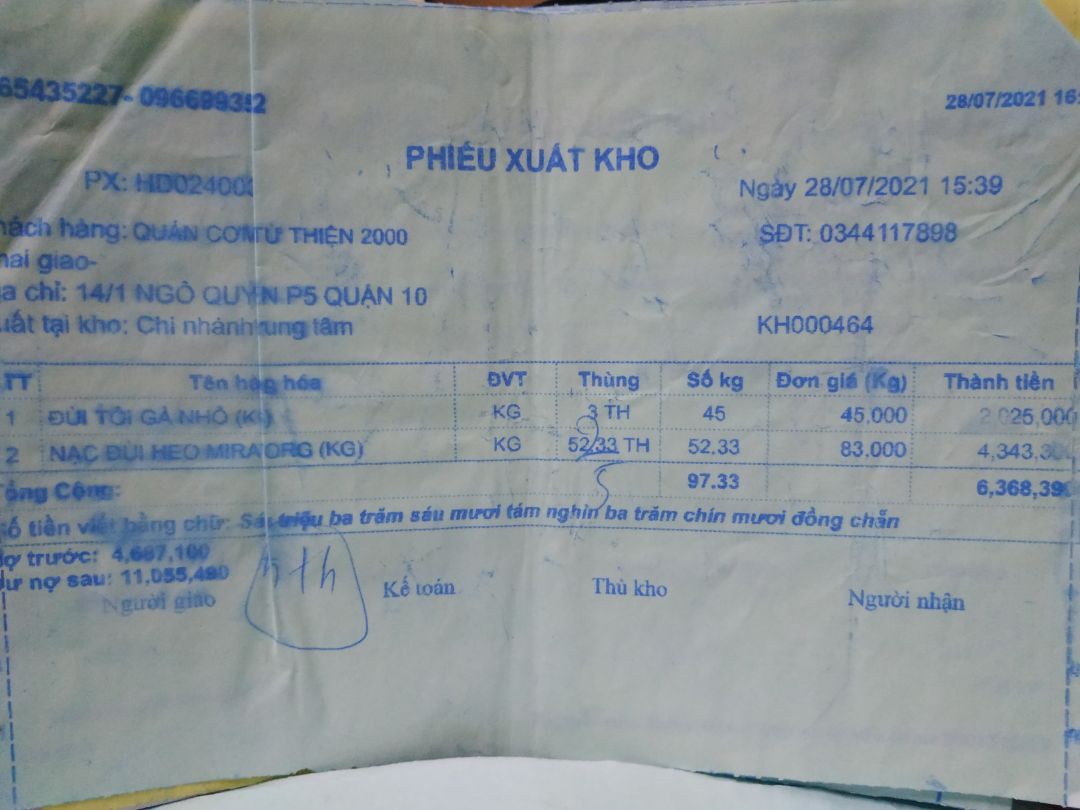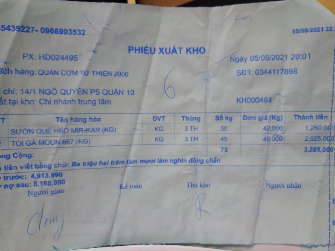 - Mua 145.12kg đùi gà tỏi: 45,000đ/kg x 145.12kg = 6,530,400đ