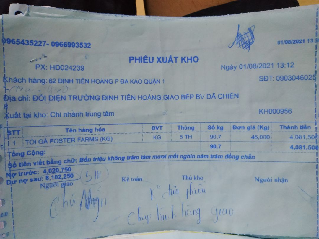 - Mua 235.82 kg đùi gà tỏi: 45,000đ/kg x 235.82kg = 10,611,900đ