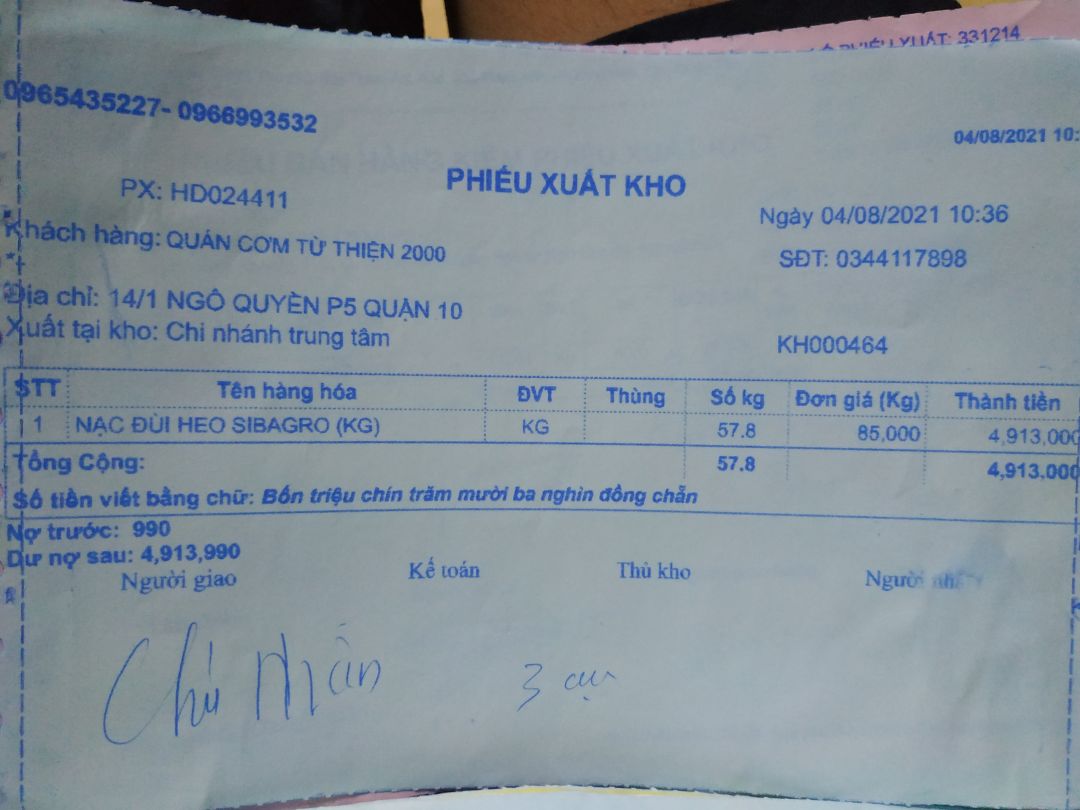 - Mua 21.7kg nạc đùi heo: 83,000đ/kg x 21.7kg = 1,801,100đ