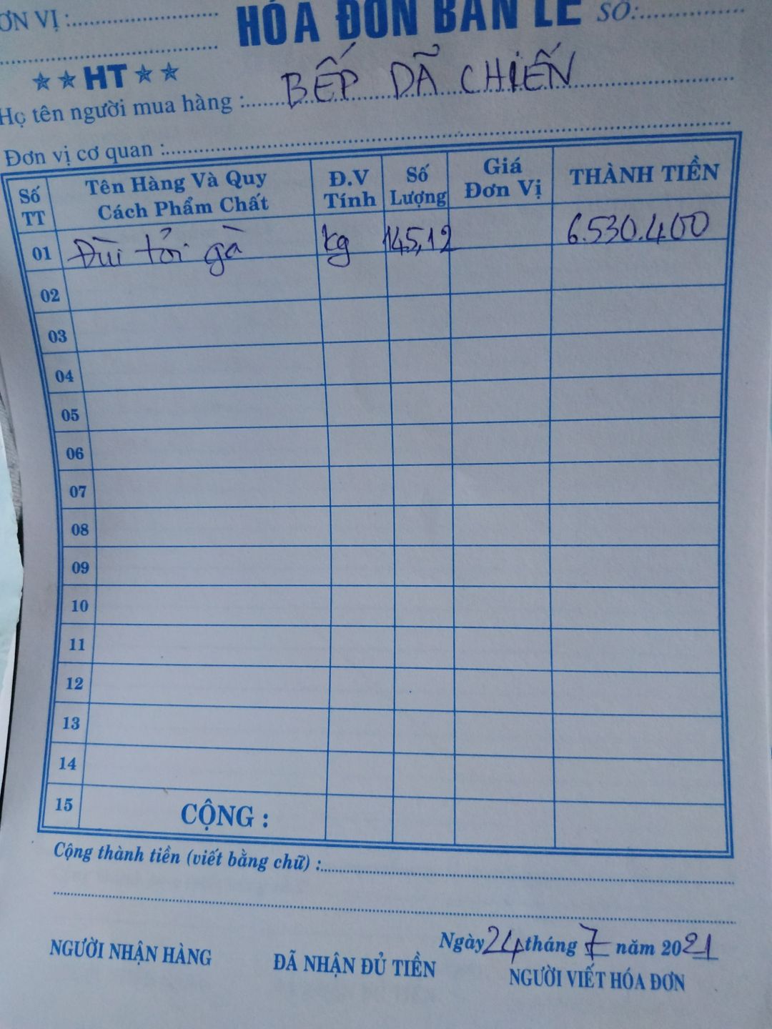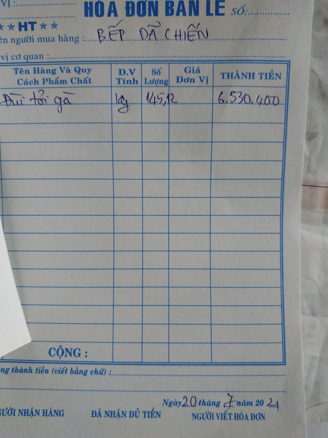 - Mua 145.12kg đùi gà tỏi: 45,000đ/kg x 145.12kg = 6,530,400đ