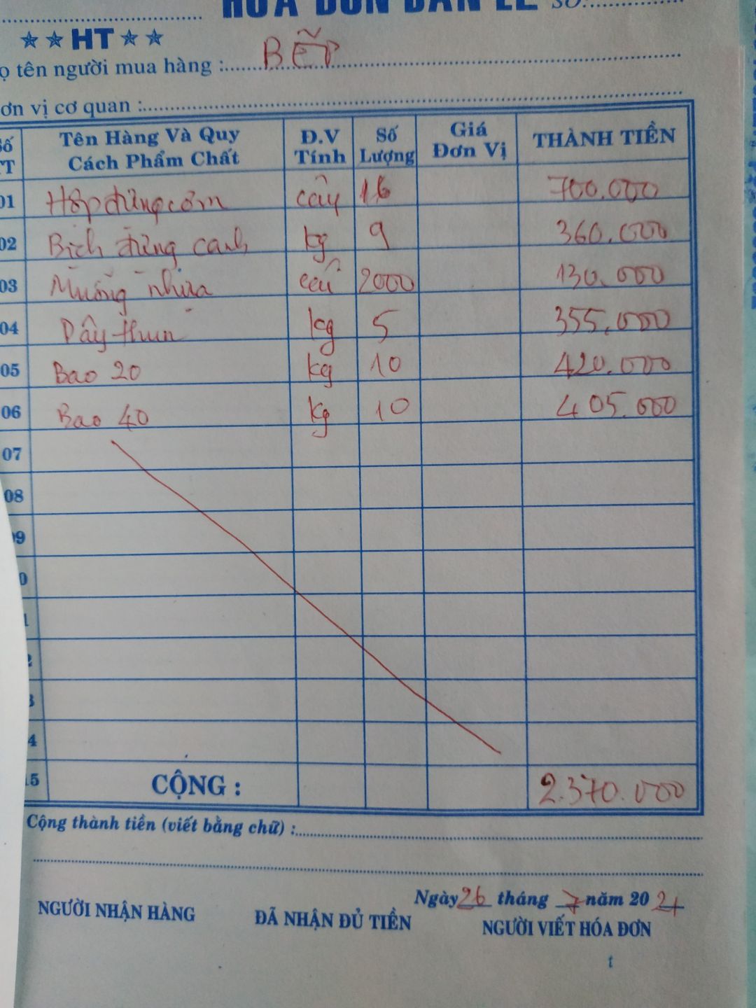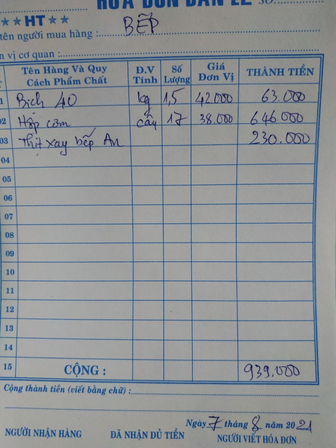 - Mua 15 cây hộp đựng cơm : 40,000đ/cây x 15 cây = 600,000đ