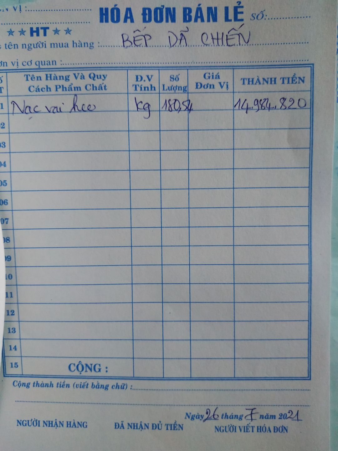 - Mua 180.54kg nạc vai heo: 83,000đ/kg x 180.54kg = 14,984,820đ