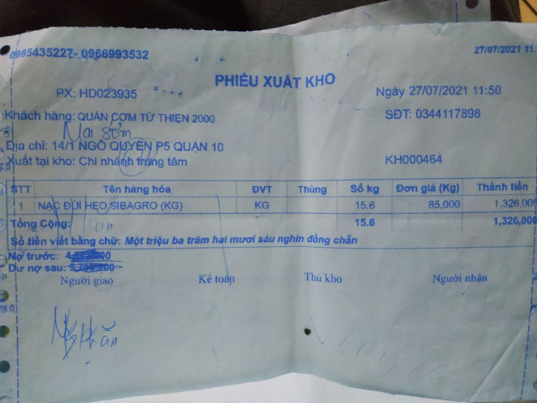- Mua 15.6kg nạc đùi heo: 85,000đ/kg x 15.6kg = 1,326,000đ