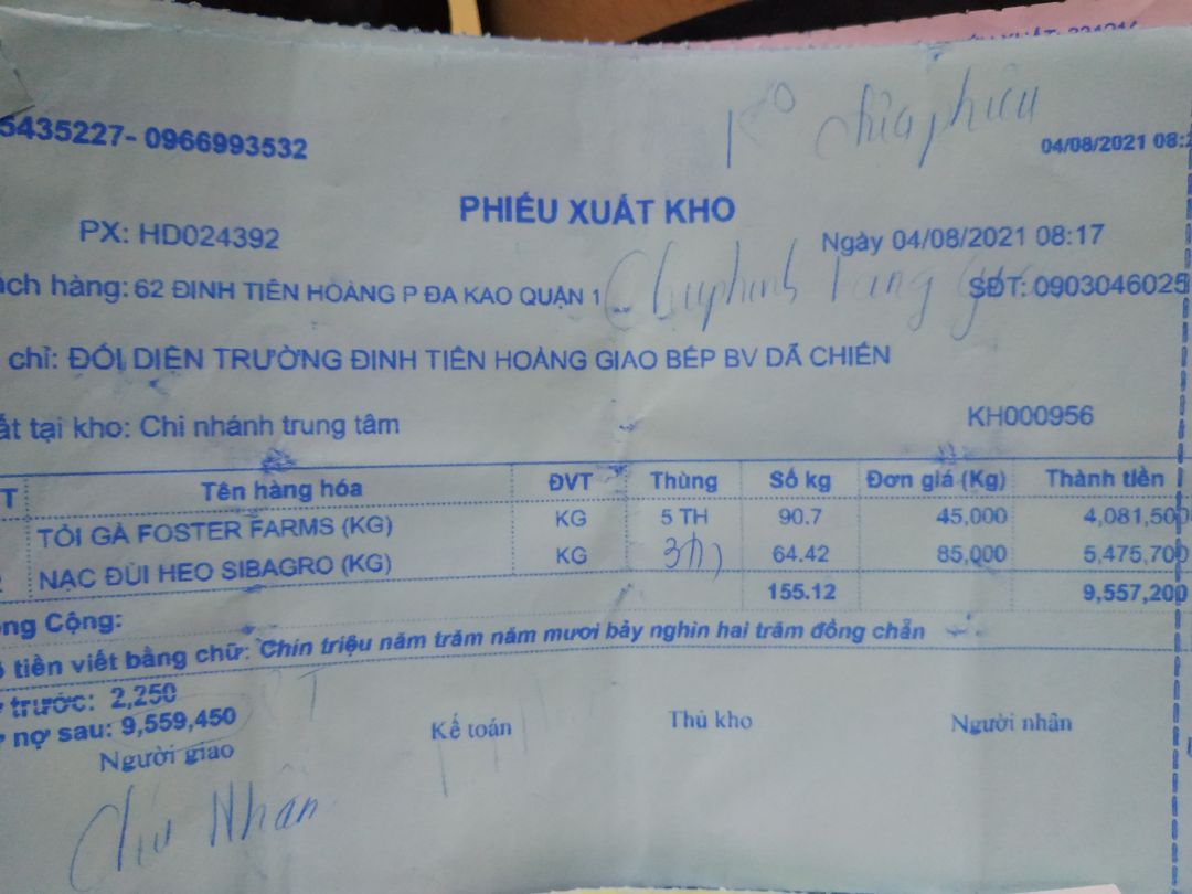 - Mua 235.82 kg đùi gà tỏi: 45,000đ/kg x 235.82kg = 10,611,900đ