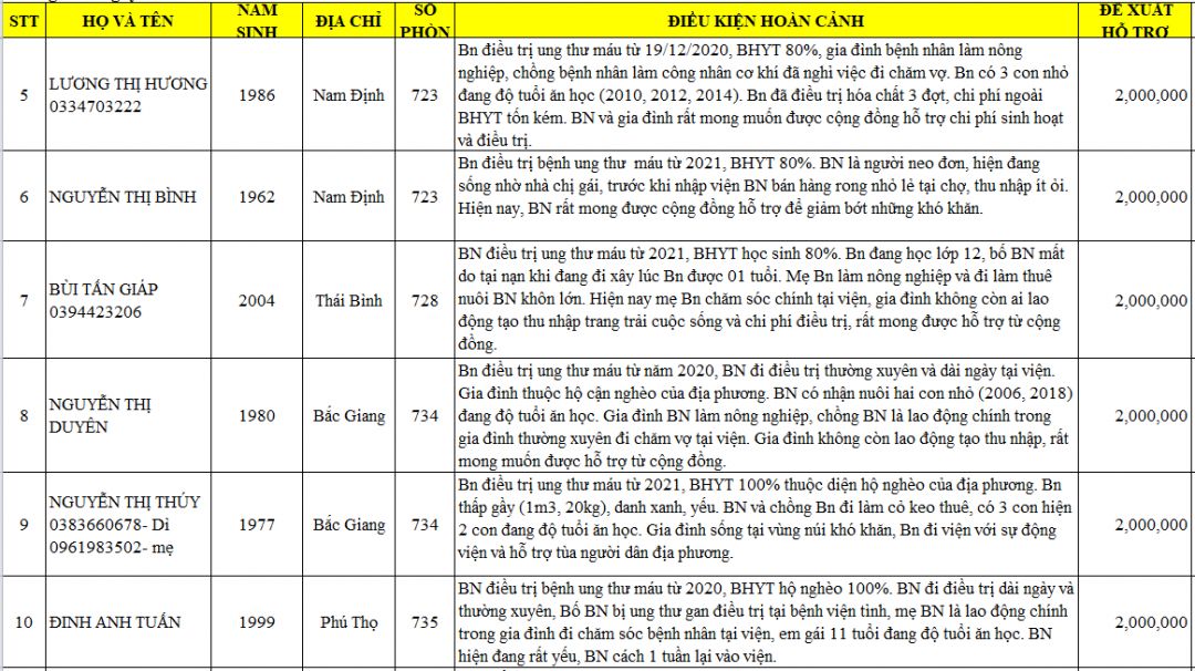2- Trường hợp đặc biệt khó khăn bệnh nặng:1 người x 10tr = 10tr