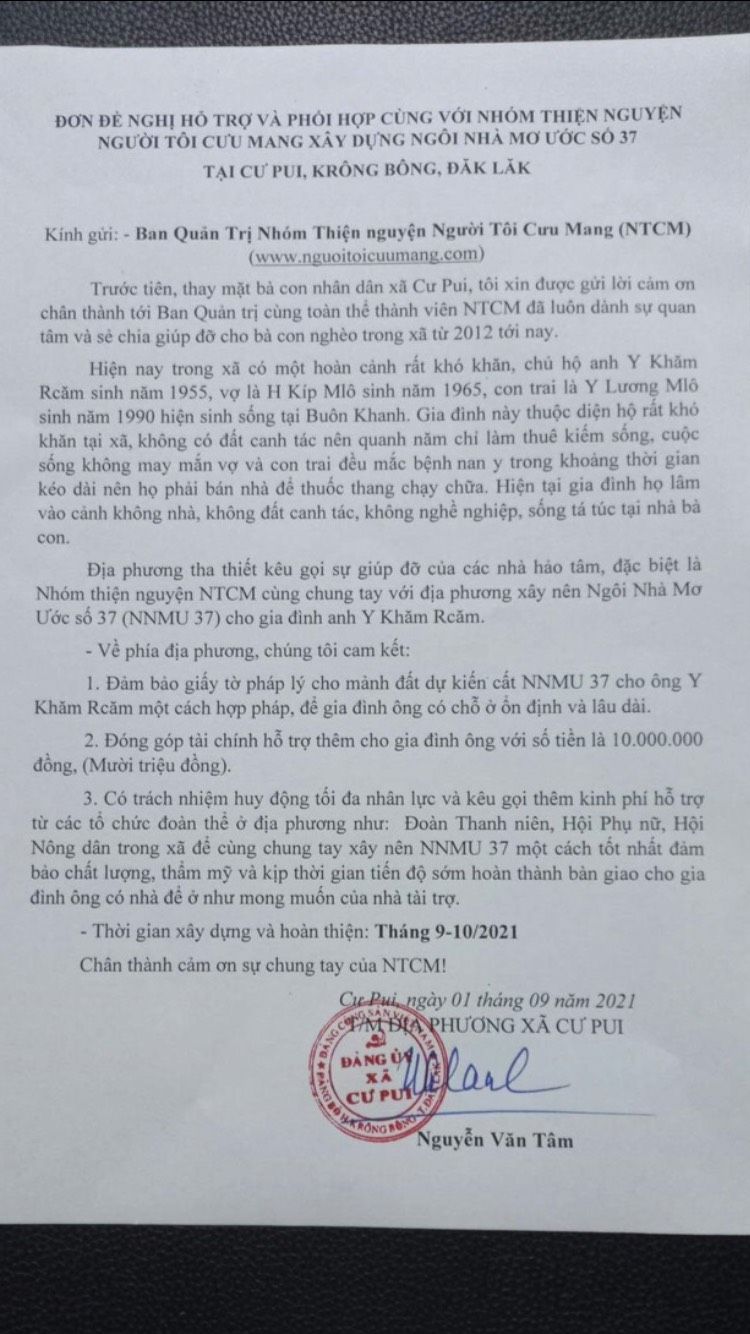 Chính quyền địa phương đã có đơn xin phối hợp hỗ trợ cho ngôi nhà MU 37 gủi NTCM ạ