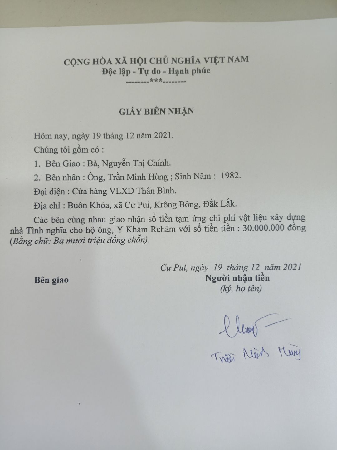 Ngôi nhà của chú Y Khăm_ buôn Khanh đã vào giai đoạn sắp hoàn thiện. Nên e xin phép được ứng thêm số tiền 30.000.000đ để thanh toán thêm cho bên thi công ạ.