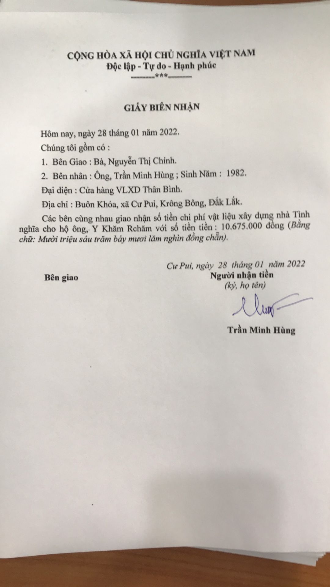 Mình chụp lại các hoá đơn, biên nhận mua vật liệu để xây dựng ngôi nhà số 37 đây ạ. Và có ứng tiền trước của UBMT TQ xã để thanh toán tiền công thợ xây ngôi nhà.