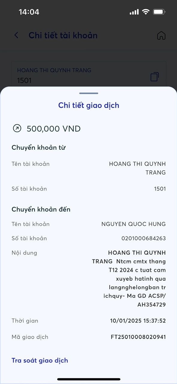 Ngày 10/1 Quỹ đã chuyển 500k của bạn Vịt giúp vào tài khoản bác, song Vịt copy tài khoản từ mẫu chuyển tiền cũ của tháng 12 nên nội dung vẫn là CMTX t12 nhưng thực ra là khoản KTX tháng 1 bác nhé. Cảm ơn bác.