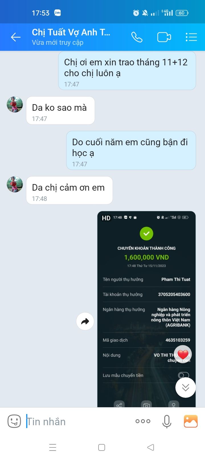 Vịt đã thực hiện chuyển cmtx vào tài khoản chị Tuất. Thân