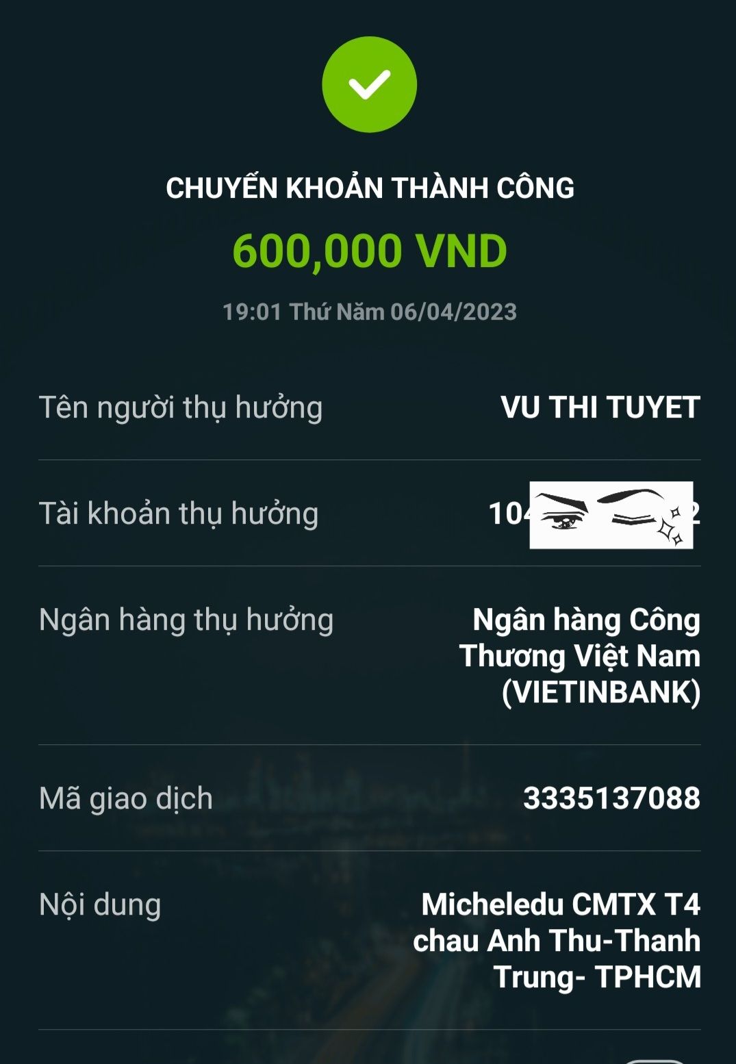 Lathuvang đã chuyển CMTX T3/23 đến 2 cháu Anh Thư, Thành Trung của Michele_du và GĐ.