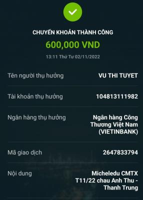 Lathuvang đã trung chuyển TK chị Tuyết 600,000đ CMTX T9/22 hai cháu Anh Thư- Thành Trung của Michele_du và GĐ.