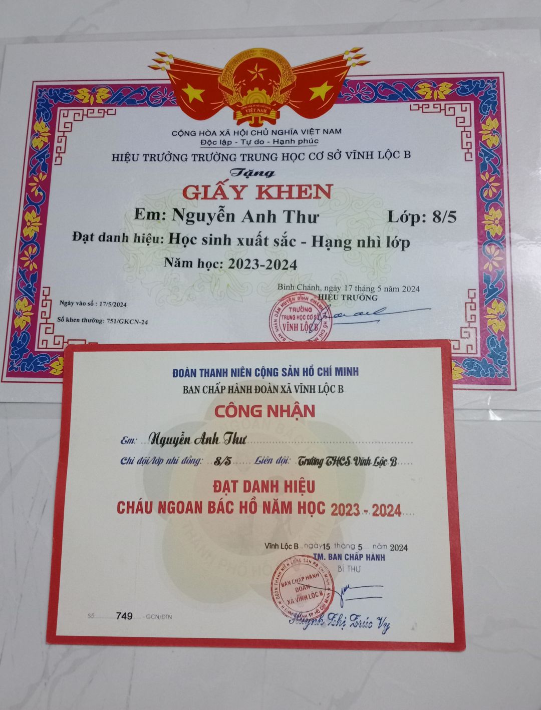 Vậy là năm học 2023_2024 đã kết thúc. Hai chị em con đã hoàn thành tốt năm học 1 lần nữa con xin gửi lời cảm ơn tới cô Michele_du và gia đình cùng các cô chú NTCM. Và hôm nay 2 chị em con đã chính thức nghỉ hè. Hai chị em con cũng được một chút thành tích về học tập .Con xin gửi lên cho cả nhà cùng xem