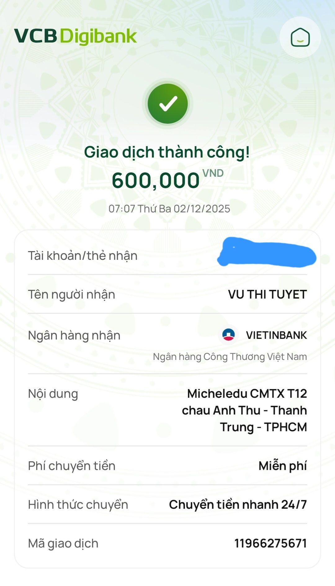 Lathuvang đã chuyển CMTX T3/26 đến cháu Anh Thư - Thành Trung - TPHCM.