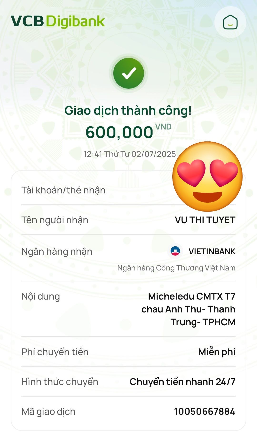 CMTX T01/2026 của cô Michele_du và GĐ đã đươc chuyển đến cháu Anh Thư -Thành Trung.