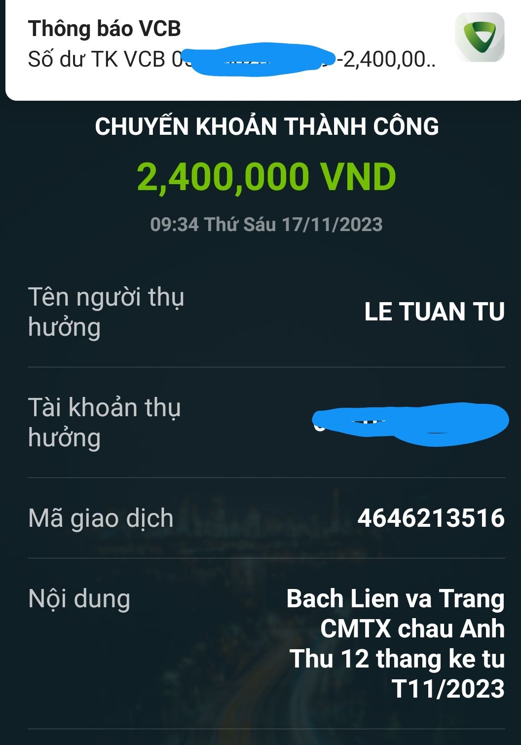 @trangvitgioi : Em xuất quỹ chuyển tới @letuantu 600,000₫ tiền CMTX cháu Anh Thư 2 tháng 11&12/2023 dùm nhé.